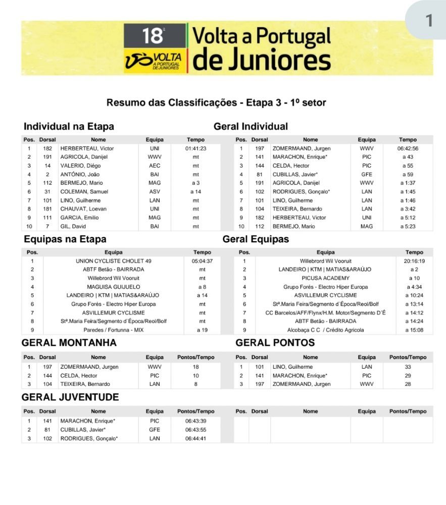 El francés Victor Herbreteau (Union Cycliste Cholet 49) ganó el primer sector de la tercera etapa de la Vuelta a Portugal Junior, un recorrido de 78 kilómetros entre Sabugal y Penamacor, que dejó al holandés Jurgen Zoomermaand (Willebrord Wil Vooruit) en posesión del maillot amarillo. .