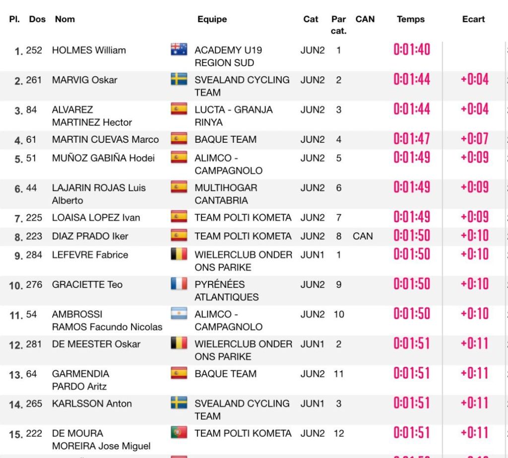 Willian Holmes (Academy U19) se ha impuesto en la primera etapa de la Vuelta Ciclista a Cantabria Júnior, una contrarreloj individual de 0,840 kilómetros con salida del Ayuntamiento de Santander y llegada en la Cuesta de la Atalaya. Óscar Marvig (Svealand) ha terminado segundo y Héctor Álvarez (Lucta Granja), tercero. Hugo Ortuño finaliza en la plaza 18; Antonio Ramírez, en la 19 ; y Óscar Orts en el 25.