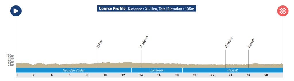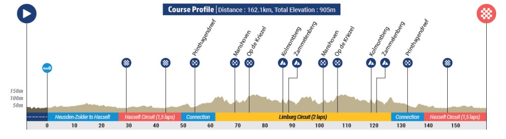 La prueba en línea sub23 masculina se llevará a cabo el viernes 13 de septiembre a partir de las 13:15 h y recibirá, al igual que todas las carreras, la salida desde Heusden-Zolder. En total, encararán un recorrido de 162 km, que no llega a acumular 1.000 metros de desnivel, y que con respecto al trazado de los juniors únicamente presentará una variante: darán dos vueltas en lugar de una al “Limburg Circuito”, por lo que atravesarán en dos ocasiones las cotas de Kolmontberg y Zammelenberg y los tramos de pavés de Manshoven y Op de Kriezel, que están llamados a ser los puntos claves de la carrera.