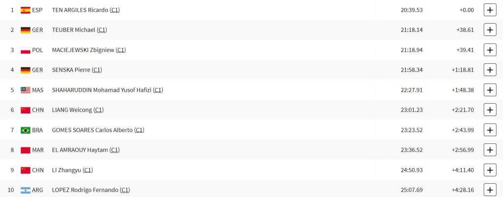 En el punto intermedio del kilómetro 5’8, Ten ha parado el reloj en 7’14” y con ello ha logrado una ventaja de 15” con respecto al polaco Maciejewski y el alemán Teuber, que mantenían una igualada pugna en la que menos de un segundo les separaba. La segunda mitad de la contrarreloj del ciclista valenciano ha sido un completo espectáculo. Se ha vaciado sobre su bicicleta para llegar completamente exhausto a la meta tras completar los 14,1 km de recorrido y proclamarse por primera vez campeón paralímpico de contrarreloj C1 con una ventaja de 38” sobre Michael Teuber, que ha sido segundo, y de 39” con Zbigniew Maciejewski, que ha concluido tercero.