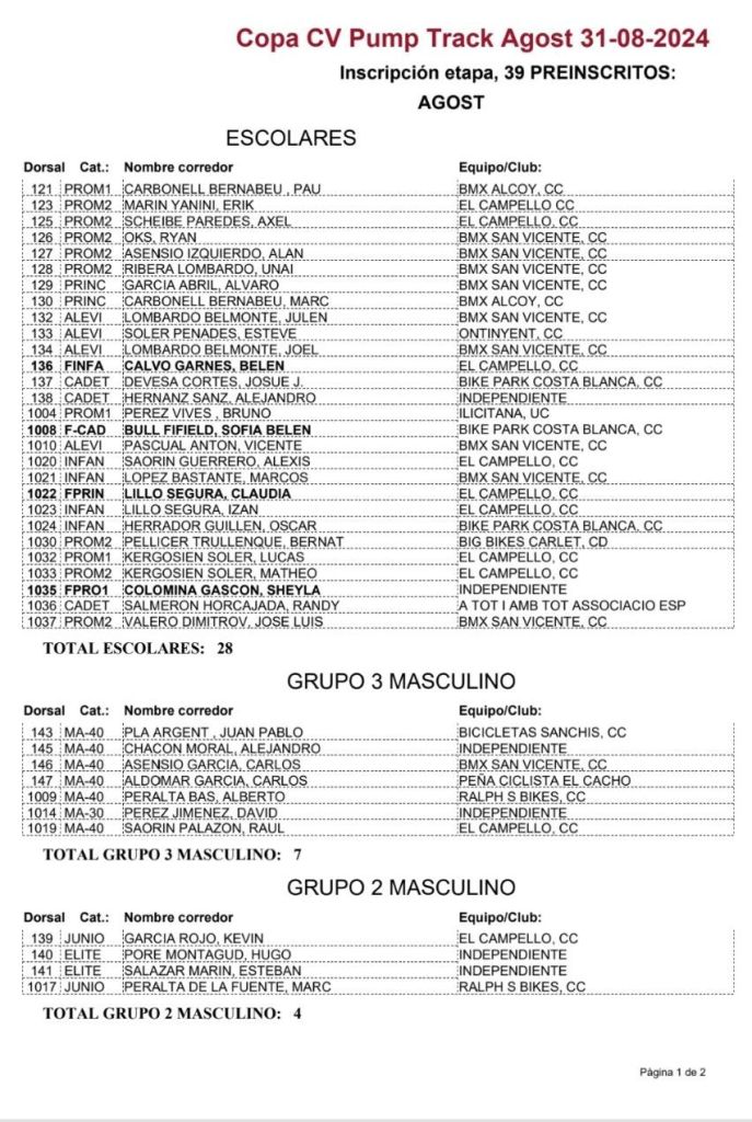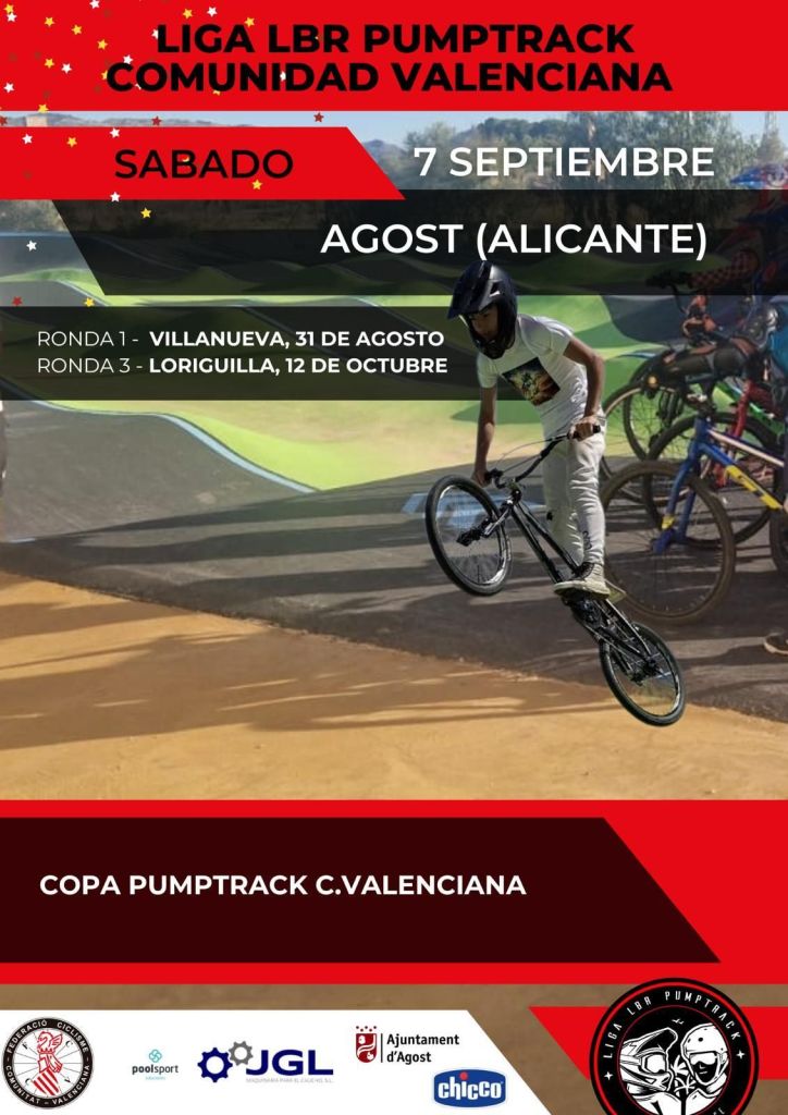 Agost afronta el sábado, 7 de septiembre, la segunda jornada de la Liga LBR Copa Comunidad Valenciana de Pumptrack 2024 que se inició el pasado fin de semana en Castelló de la Ribera. Joan Pau (Bicicletas Sanchis), en Máster 40; Álvaro García (BMX San Vicente), en Principiantes; y, Alan Asensio (BMX San Vicente), en Promesas; y Joel Lombardo (BMX San Vicente), en Alevines, llegan como líderes a la localidad alicantina.