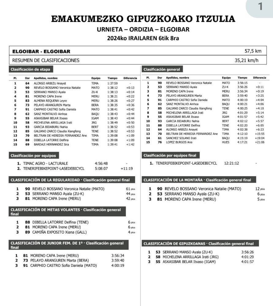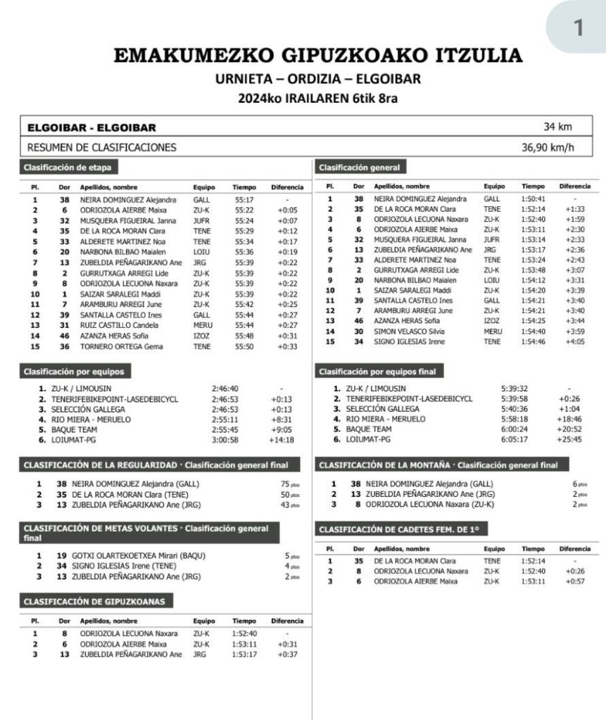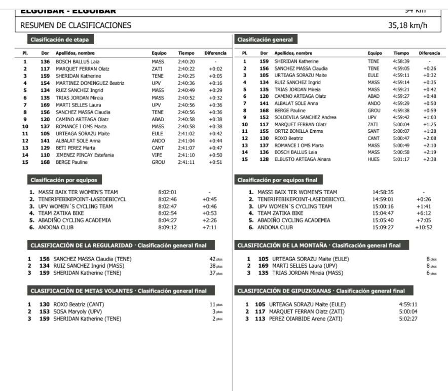 En júniors, triunfo de Anayet Ibáñez (Timac Agro). Leyre Almena (Río Miera) ha finalizado quinta y Claudia Xiangfeng Galiano, duodécima. Verónica Natalie Revelo (Matos) se ha impuesto en la general y Claudia termina séptima. Por equipos se ha impuesto el Tenerife.