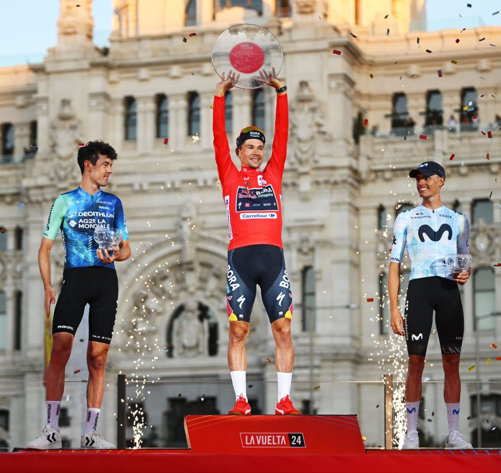 La Roja de Roglic ha sido el premio grande del podio final de Madrid, que también ha entregado los premios de la clasificación por puntos a Kaden Groves (Alpecin-Deceuninck), de la clasificación de la montaña de Jay Vine (UAE Team Emirates), de la clasificación del mejor joven de Mattias Skjelmose (Lidl-Trek), que en la contrarreloj ha desbancado a David Gaudu en el 5º puesto en la general final, el premio al mejor equipo de UAE Team Emirates y el premio al Supercombativo para Marc Soler (UAE Team Emirates).