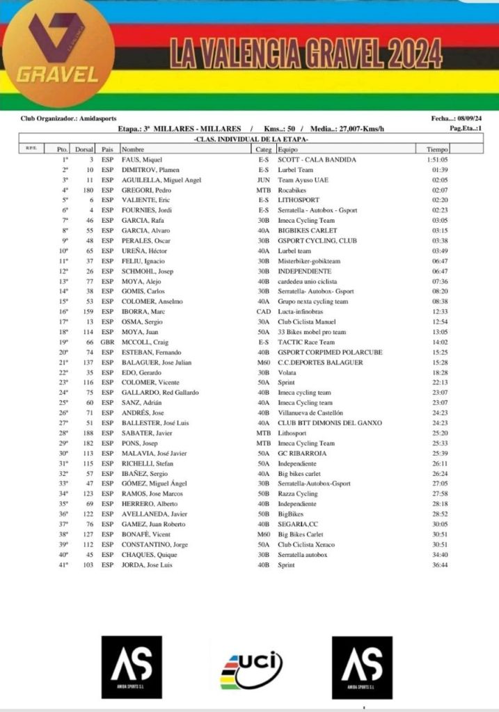 Miquel Faus (Scott Cala Bandida) se ha impuesto en la tercera y última etapa de La València Gravel disputada en Millares sobre una distancia de 50 kilómetros. Plamen Dimitrov (Lurbel) ha sido segundo y Miguel Ángel Aguilella (Ayuso Team), tercero. Jordi Fournies (Serretella) ha ganado la general.