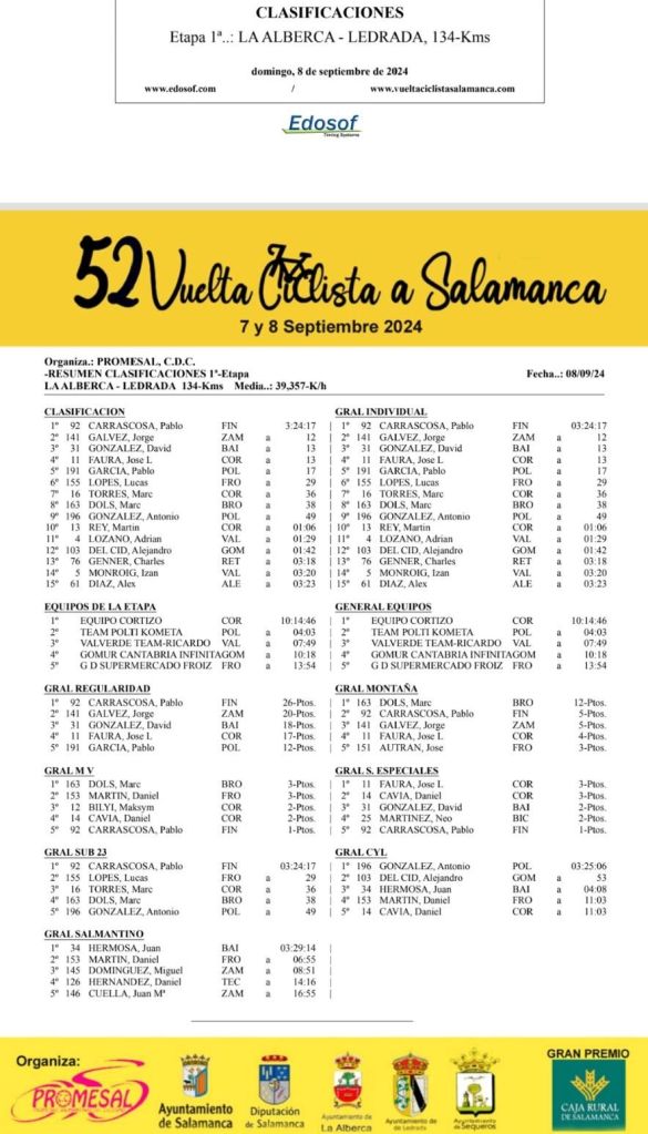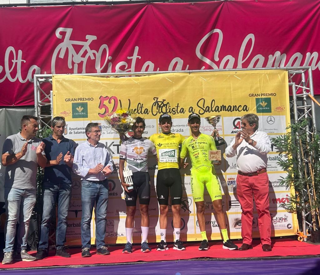 Pablo Carrascosa (Equipo Finisher) se ha impuesto en la primera etapa de la Vuelta Ciclista a Salamanca que ha unido La Alberca y Ledrada tras 133,8 kilómetros de recorrido. Jorge Gálvez (Zamora EnaCyclng) y