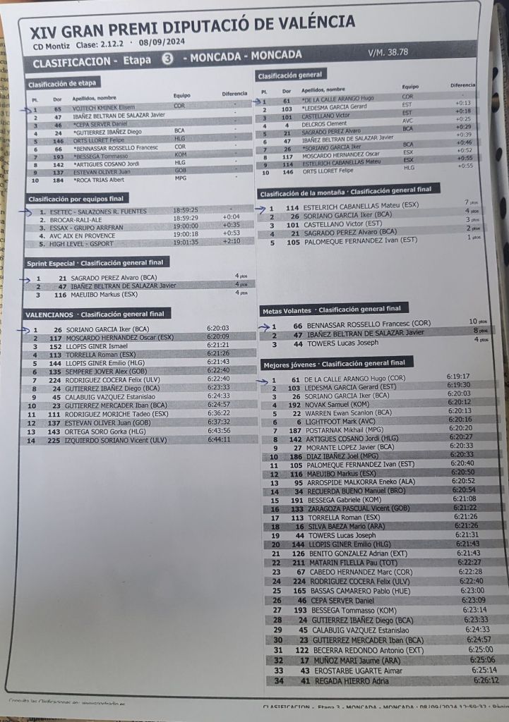 En la parte final, el Team Polti Kometa se incorporó a la persecución y llegaron a neutralizar ese corte aunque con el pelotón muy estirado. Ya dentro de las calles de Moncada, en la última recta se lanzaba el esprint que consiguió llevarse el propio Vojtech Kmínek (Cortizo) por delante de Javier Ibáñez y Dani Cepa (Caja Rural ALEA). En la clasificación general, no había cambios con Hugo de la Calle manteniendo el liderato con Gerard Ledesma y Víctor Castellano (ESETEC Salazones Ricardo Fuentes) completando el pódium.