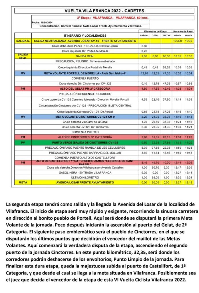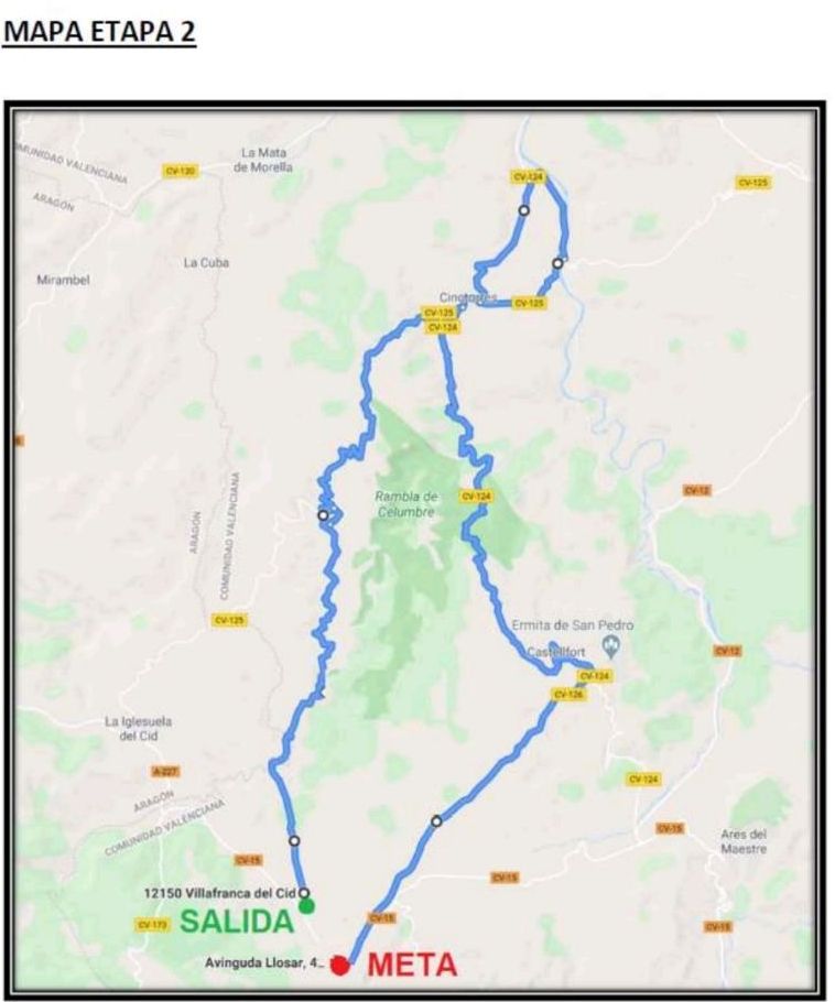 El domingo por la mañana la segunda etapa empezará en Vilafranca, se dará una vuelta de 60 km por el término y se volverá a la meta, que también se encontrará dentro del municipio. Esta etapa saldrá desde delante del Ayuntamiento del municipio y continuará dirección Portell. Aquí se continuará hacia Cinctorres, subiendo el puerto del Helado. Después empezará la subida hasta llegar a Castellfort. Por último, se continuará hasta Vilafranca, donde la meta estará en la avenida del Llosar.