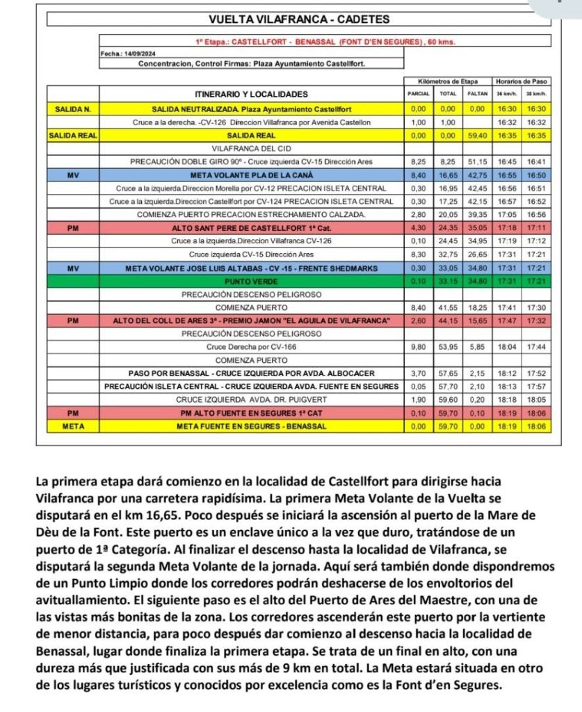 La primera etapa se disputará el sábado 14 de septiembre a las 16:30 h. Será una etapa de 60 km que irá desde Castellfort hasta la Font d’En Segures de Benassal. La Vuelta se iniciará en la plaza del Ayuntamiento de Castellfort, irá hasta Vilafranca para dirigirse hacia el puerto de Sant Pere de Castellfort. Después se volverá hacia Vilafranca y posteriormente dirección hacia el puerto de Ares del Maestrat. Una vez realizado el descenso se continuará dirección Benassal hasta llegar a la Font d’En Segures, donde se encontrará la línea de meta.