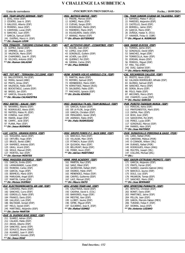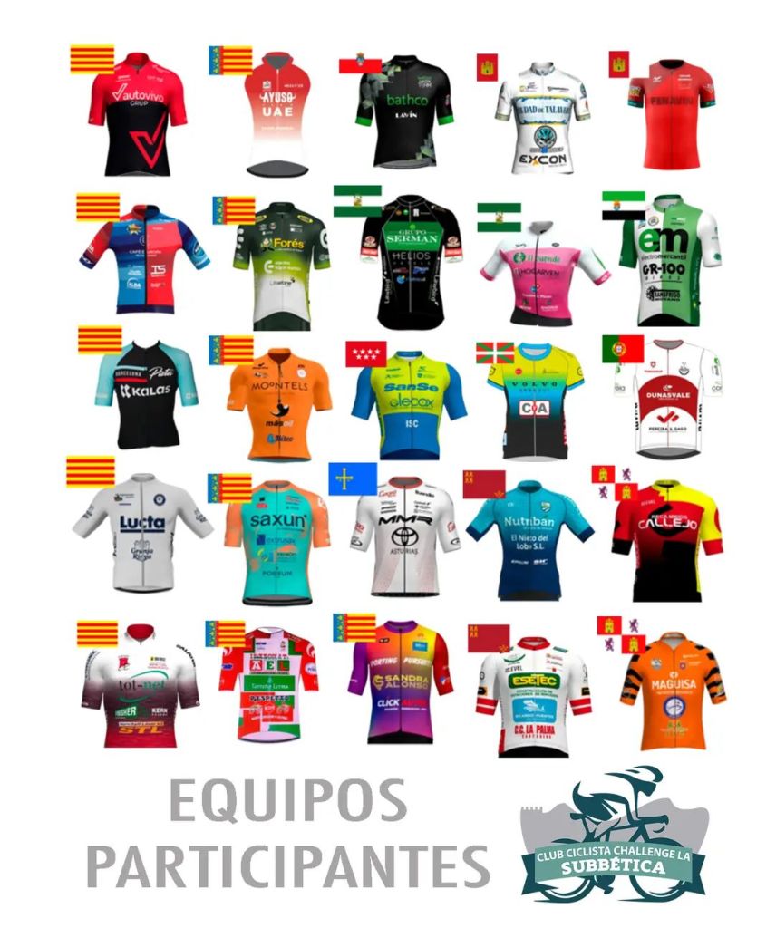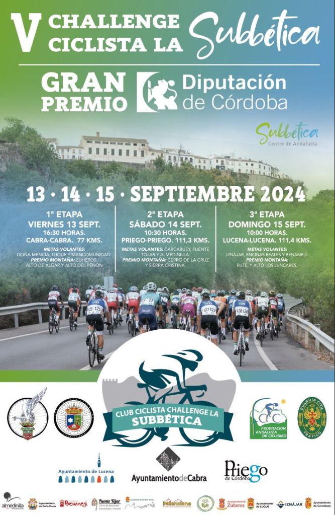 Este fin de semana, los días 13, 14 y 15 de septiembre, se disputa la quinta edición de la Challenge Ciclista La Subbética. La prueba contará con una participación de entorno a 152 corredores, divididos en 26 escuadras de 7 corredores llegadas de Castilla la Mancha, Madrid, Murcia, Cataluña, País Vasco, Comunidad Valenciana, Castilla León, Cantabria, Aragón, Asturias, Extremadura, Galicia, Navarra y Andalucía, que pondrán en liza los mejores corredores júnior del panorama nacional.