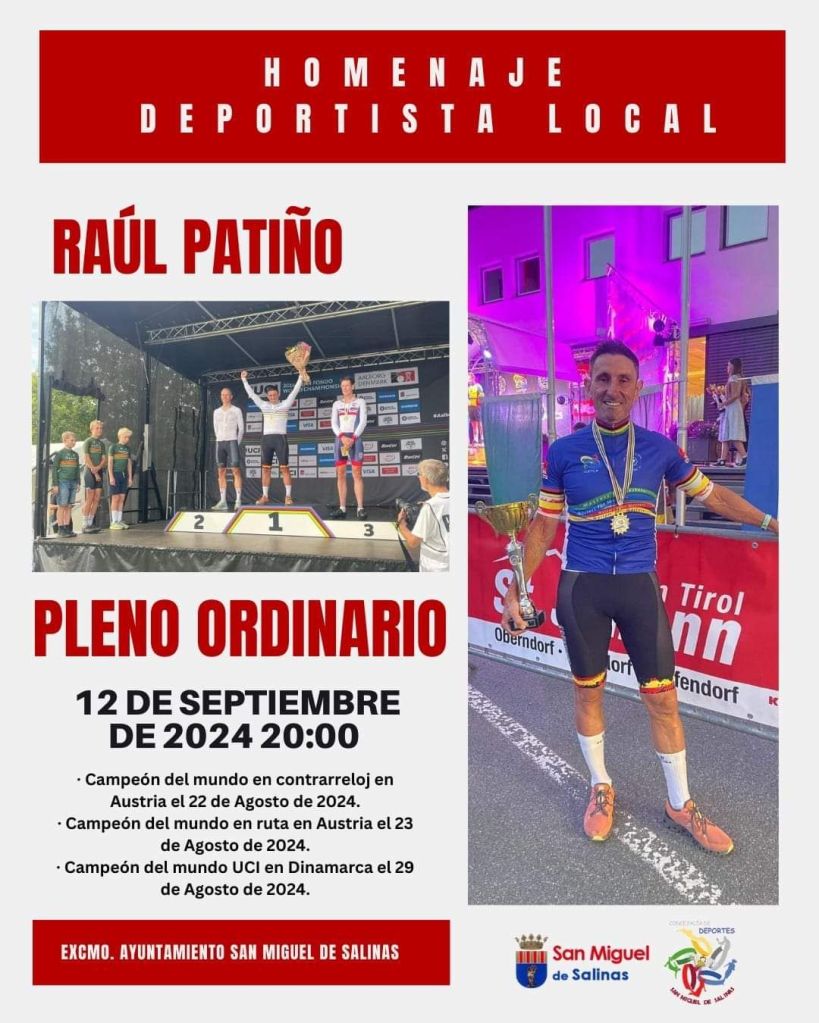 El pleno del Ayuntamiento de San Miguel de Salinas rendirá homenaje el jueves, 12 de septiembre, a Raúl Patiño Delgado. «Con su talento y dedicación, Raúl ha llevado el nombre de nuestro pueblo a lo más alto del ciclismo internacional», se asegura desde la Corporación Municipal de la Vega Baja. Raúl, se insiste, «es un ejemplo de superación y un verdadero embajador de San Miguel de Salinas. ¡Gracias por inspirarnos y por poner en lo más alto el nombre de nuestro municipio. Orgullo local».