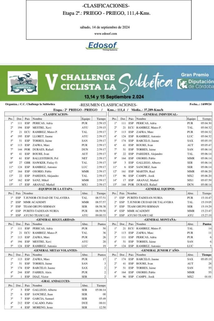 Adrià Pericas (Purito) repite triunfo y es más líder de la V Challenge Ciclista La Subbética. Pericas se ha impuesto en la segunda etapa con salida y meta en Priego y 111,2 kilómetros de recorrido. Xavi Mestre (Ayuso) ha terminado segundo y Mateo P. Ramírez (Talavera), tercero. Cuarta plaza para Jaume Lloret (Ayuso).