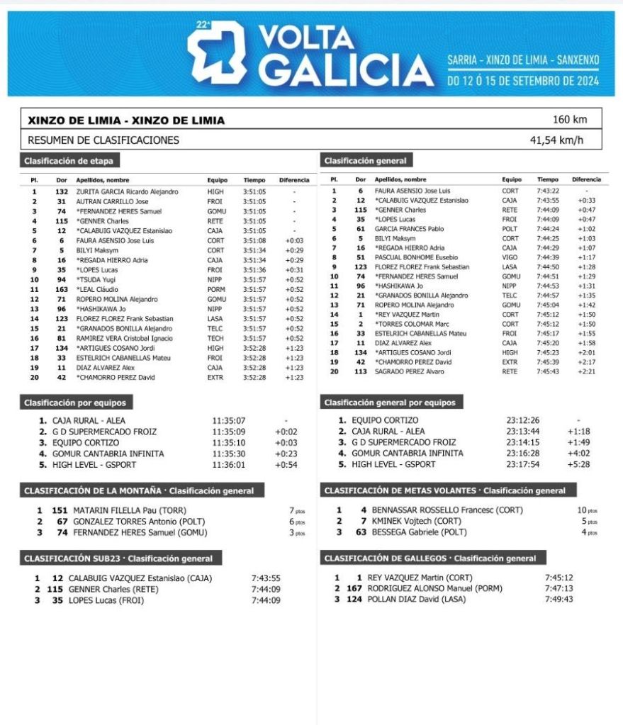 En la general, José Luis Faura (Cortizo) es el nuevo líder con Estanislao Calabuig (Filial Caja Rural) segundo y primer joven (Mejor Sub23). Pau Matarin domina la clasificación de la montaña; Francesc Bennassar, la de las metas volantes; y el Cortizo en la mejor escuadra. AVANCE