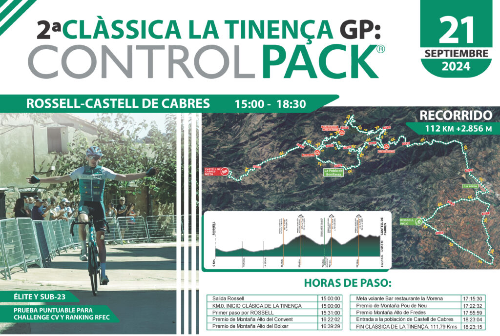El sábado, 21 de septiembre, se disputa, a partir de las 15 horas, la segunda edición de la Clàssica La Tinença GP, organizada por Controlpack. Esta exigente prueba cuenta con un recorrido de 112 kilómetros y más de 2.856 metros de desnivel positivo. La carrera, que partirá desde Rossell y finalizará en el histórico Castell de Cabres, atravesará algunos de los parajes más espectaculares de la Tinença de Benifassà.