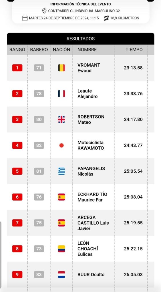 Ricardo Ten (C1) ha logrado su 15º título de campeón del mundo, incluyendo los de Pista, en una contrarreloj que, a priori, no le beneficiaba. El valenciano ha sacado su raza y orgullo y ha vencido con una renta de 16 segundos sobre el polaco Zbigniew Maciejewski y 39 sobre el neerlandés Andre Wijnhoud. Una soberbia crono para Ten, que en esta disciplina se ha mostrado como el claro dominador de los últimos años. En C2, Maurice Eckhard reaparecía tras su lesión y conseguía un meritorio sexto puesto, a 1:54 del belga Vromant, mientras que Luis Arcega era séptimo a 2:05 del ganador. En C3, Juan Alberto Jiménez finalizaba en novena posición, a 2:09 del galo Florian Bouziani; mientras que Eduardo Santas, que tuvo que realizar la crono sin su bicicleta reglamentaria, era descalificado por los jueces.