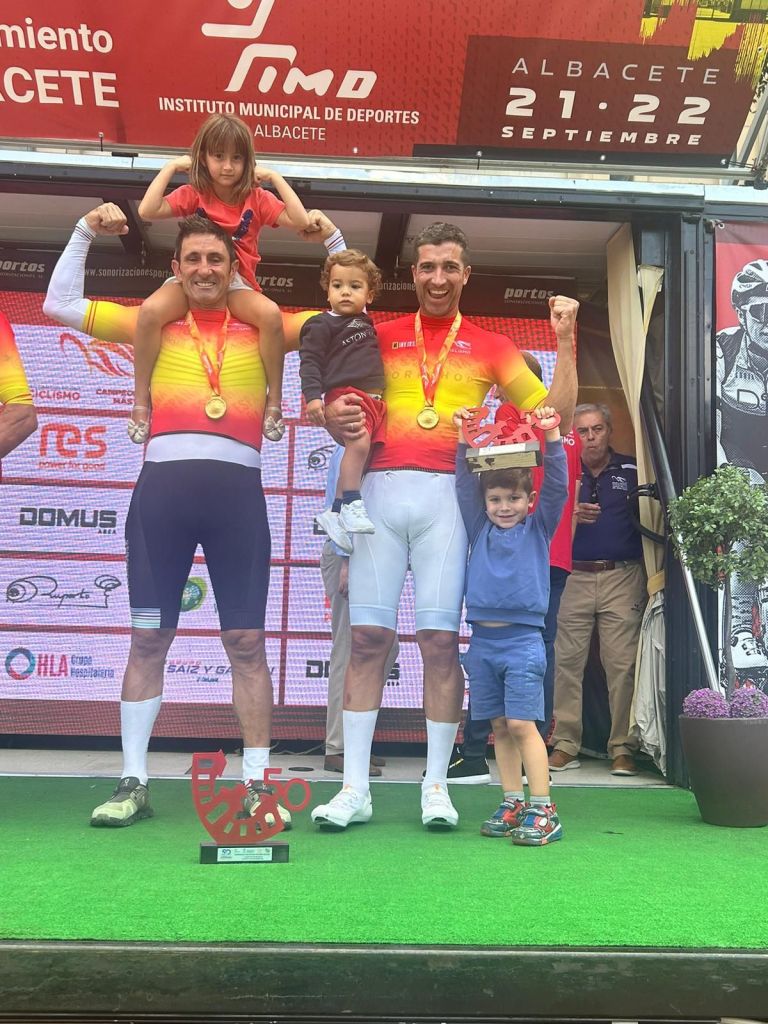 Raúl Patiño y Joaquín Giménez lograron del domingo en Albacete el título de campeones de España de CRI. El alicantino, en la categoría M50A, y el murciano, en M30B. Justo un año antes de que una decisión muy rigurosa de la RFEC impidiera a ambos ciclistas participar en el Nacional de 2023 disputado en Alcalá la Real (Jaén) han conseguido el título, un reconocimiento que deja bien a las claras que en la pasada edición no se fue justo con ellos. En aquella ocasión, se cerraron las inscripciones en los 200 corredores cuando había 400 a la espera y ellos quedaron fuera a pesar de que eran campeones autonómicos.