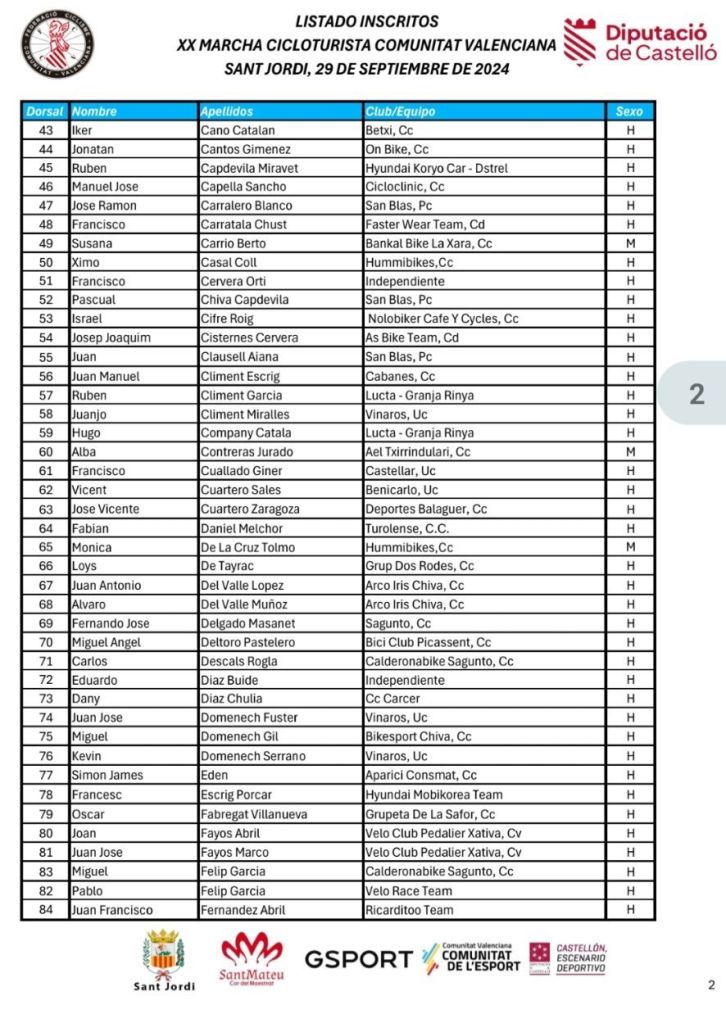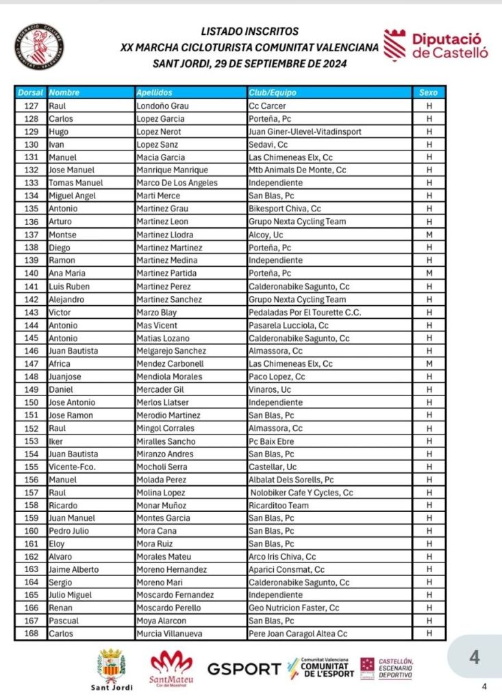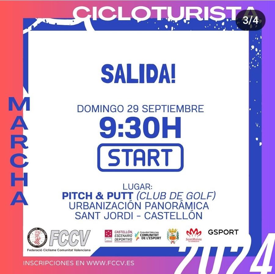 La XX Marcha Cicloturista Comunitat Valenciana se celebrará el domingo 29 de septiembre en Sant Jordi (Castellón). El eventó cuenta con un recorrido de 83 kilómetros que transcurrirá por algunos de los paisajes más icónicos del interior de la provincia de Castellón. La salida y llegada serán en la urbanización Panorámica (Sant Jordi), pasando por localidades como Cervera del Maestre, Sant Mateu, Tírig y Salsadella.