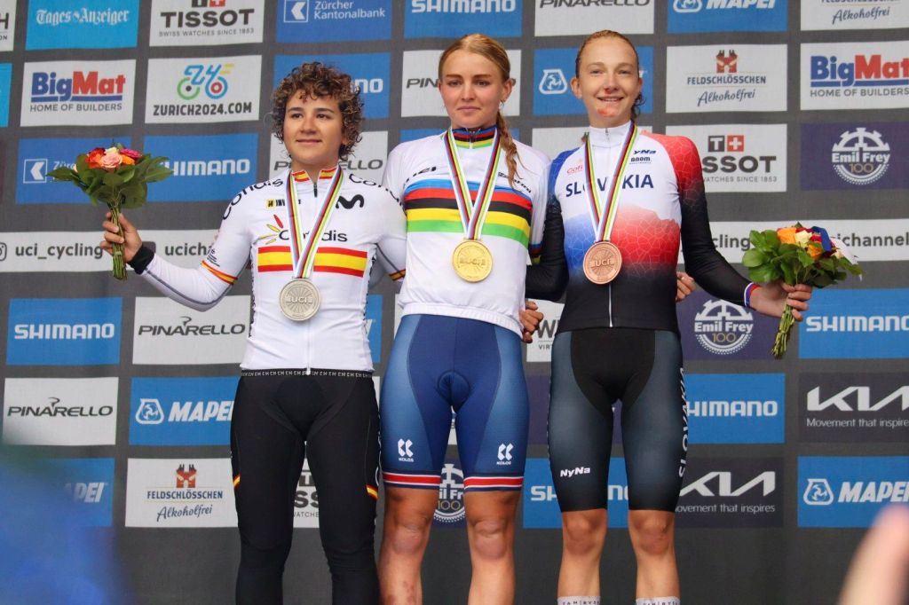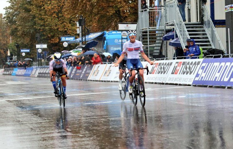 Cat Ferguson es la nueva campeona del mundo júnior de ruta. La navarra Paula Ostiz ha sido segunda. Bajo el diluvio, la británica, ya coronada en la contrarreloj hace dos días, venció a sus dos últimas rivales al sprint, la española Paula Ostiz y la eslovaca Viktoria Chladonova . Tras la canadiense Geneviève Jeanson (1999), las británicas Nicole Cooke (2001) y Zoe Backstedt (2022), la estadounidense Chloé Dygert (2015) y la italiana Elena Pirrone (2017). Cat Ferguson es la sexta corredora en lograr la doble ruta y contrarreloj en la misma edición del Mundial. Por su parte, Paula Ostiz, la primera júnior española en colgarse una medalla en un Mundial.