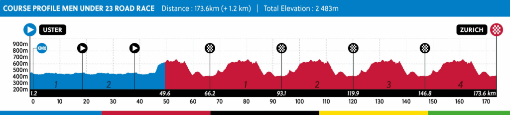 La prueba sub23 presentará un recorrido de 173,6 km, con 2.500 metros de desnivel positivo acumulado; un trazado que, si bien será duro, no ofrecerá ascensiones prolongadas, sino cortas y más explosivas. La salida será a las 12:45 horas.