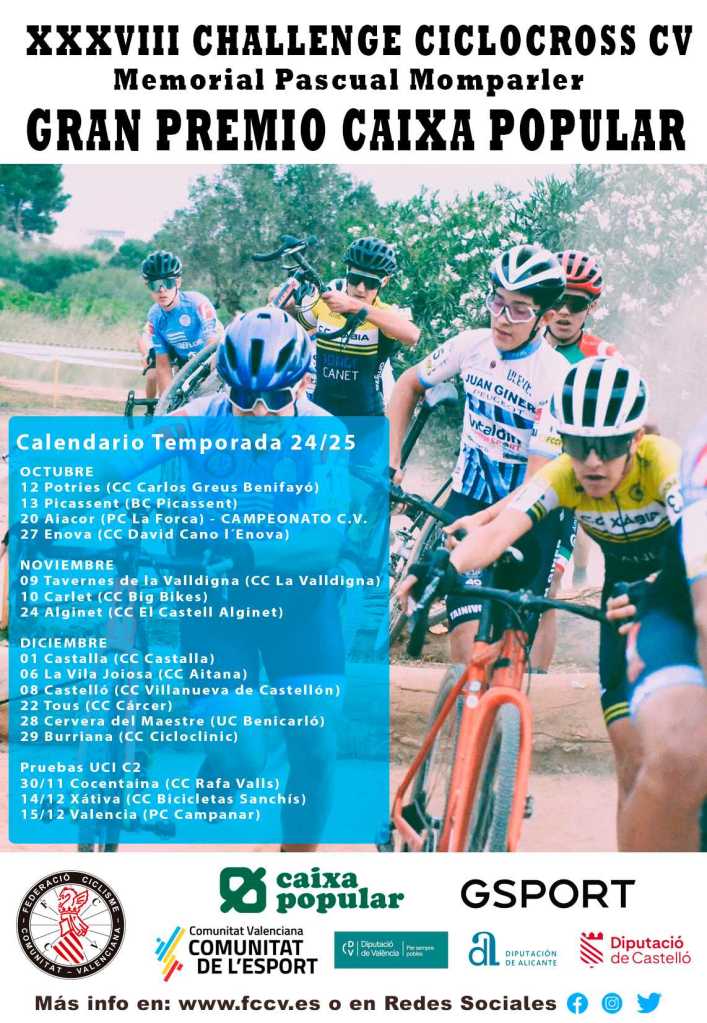 La XXXVIII edición de la Challenge de Ciclocross CV – Memorial Pascual Momparler – Gran Premi Caixa Popular comenzará el día 12 de octubre con una emocionante primera prueba en la localidad valenciana de Potries, que vuelve a formar parte del calendario tras más de una década de ausencia. No se celebraba desde el año 2011. En esta ocasión, el circuito contará con uno de sus tramos más icónicos: la subida al Calvario, un reto que sin duda pondrá a prueba la destreza y resistencia de los ciclistas.