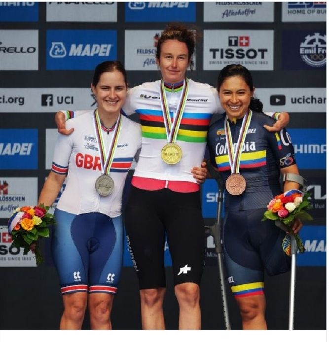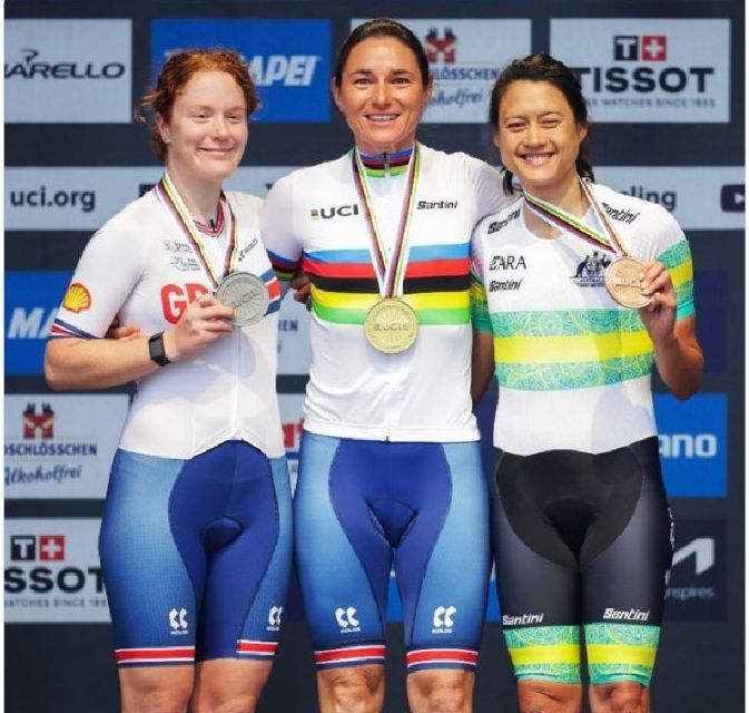 Lotte Kopecky fue quien ganó al final de una carrera loca, en condiciones climáticas terribles. La belga conserva así su título y lucirá el maillot arcoíris un año más. Kopecky aprovechó el desacuerdo de sus competidoras y una incomprensible táctica holandesa para ponerse arriba y finalmente dominar un sprint de seis corredoras. La acompañan en el podio final la estadounidense Chloé Dygert (2.ª) y la italiana Elisa Longo Borghini (3.ª).
