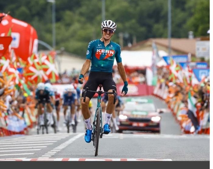 El pasado 5 de septiembre, Urko Berrade fue el gran protagonista de La Vuelta a España al alzarse como ganador de la 18ª etapa. El navarro, apoyado en la fortaleza del Equipo Kern Pharma con cuatro integrantes en la fuga, lanzó un ataque demoledor a cinco kilómetros de meta para vencer en solitario en el Parque Natural de Izki. Un triunfo que supuso el tercero del conjunto navarro en La Vuelta y el primero en profesionales de Urko.