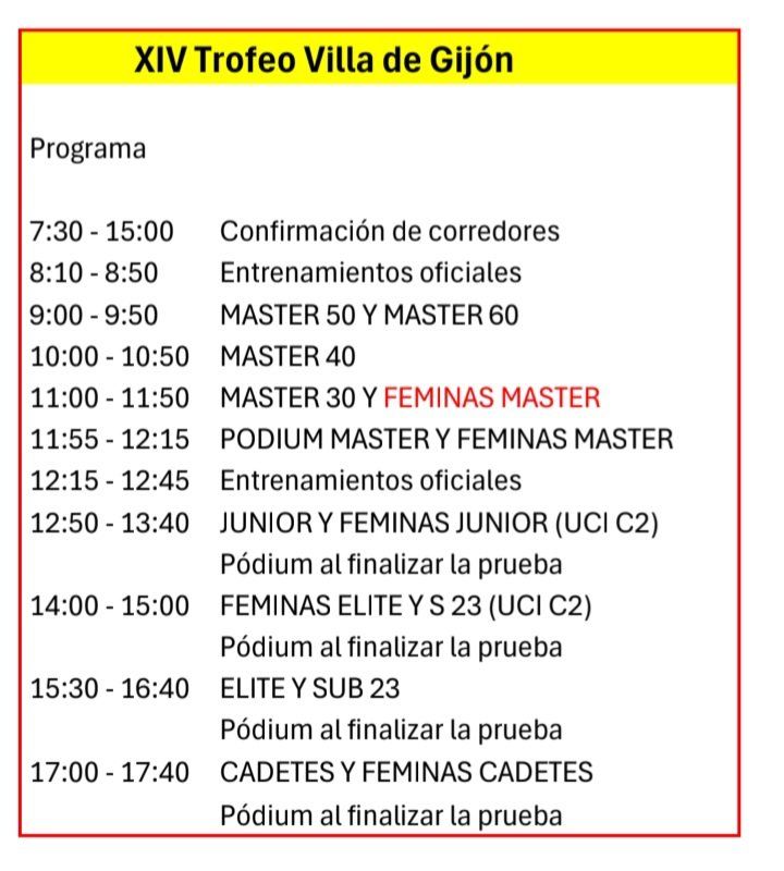 El domingo 6 de octubre, la prueba la iniciarán a las 9:00h. las categorías master 50, máster 60 y máster féminas, seguidos de los master 40 a las 10:00 h. partiendo una hora más tarde los master 30. Por su parte, la categoría junior tanto masculina como femenina arrancará a las 12:50 h., mientras que las élite-sub23 lo harán a las 14:00 h. y sus homólogos masculinos a las 15:30 h. Por último, la categoría cadete será la encargada de cerrar el telón de la competición a las 17:00 h. en el Complejo Deportivo Las Mestas de Gijón.