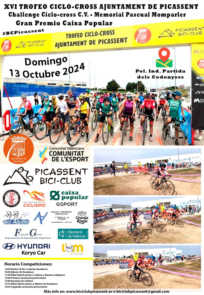 El domingo, 13 de octubre, se disputa el XVI Trofeo Ciclocross Ajuntament de Picassent, segunda prueba de la Challenge de Ciclocross CV – Memorial Pascual Momparler – Gran Premi Caixa Popular que comenzó ayer en Potries. El circuito del Poligono Industrial Partida dels Codonyers reunirá a 500 ciclistas en una matinal que promete emociones fuertes. Jordi Reñe, Vicent Bonafe, Marc Sancho, Iván Díaz, Sara Calatrava, Aroa Rodríguez, Selena Maza, Gloria Fullers y Carolina Juárez lucirán el maillot amarillo Gsport como líderes de sus categorías.
