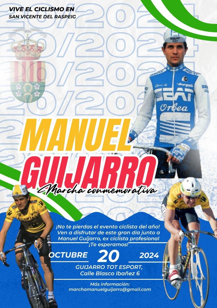 El día 20 de octubre se celebra la «Marcha conmemorativa Manuel Guijarro» organizada por el CC San Vicente bajo el lema «¡No te pierdas el evento ciclista del año!». Una buena oportunidad para disfrutar de una buena jornada de ciclismo junto al exprofesional alicantino. La salida será a las 9.30 horas desde el velódromo de San vicente del Raspeig y cuenta con un recorrido de 95 kilómetros. Los inscritos reciben un maillot exclusivo de alta calidad.