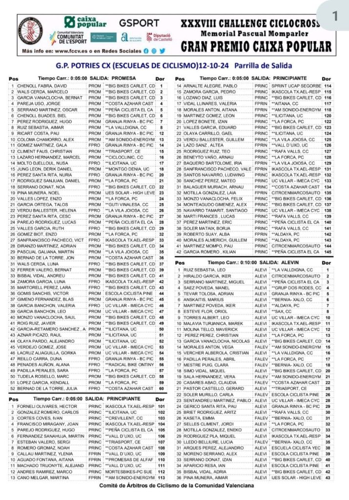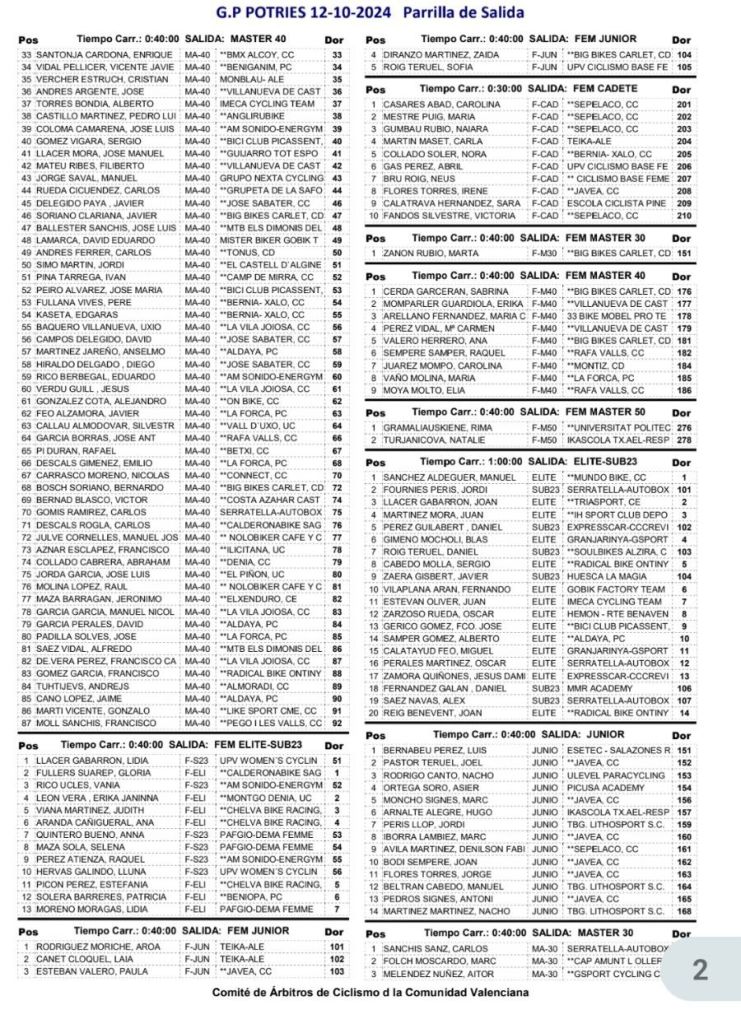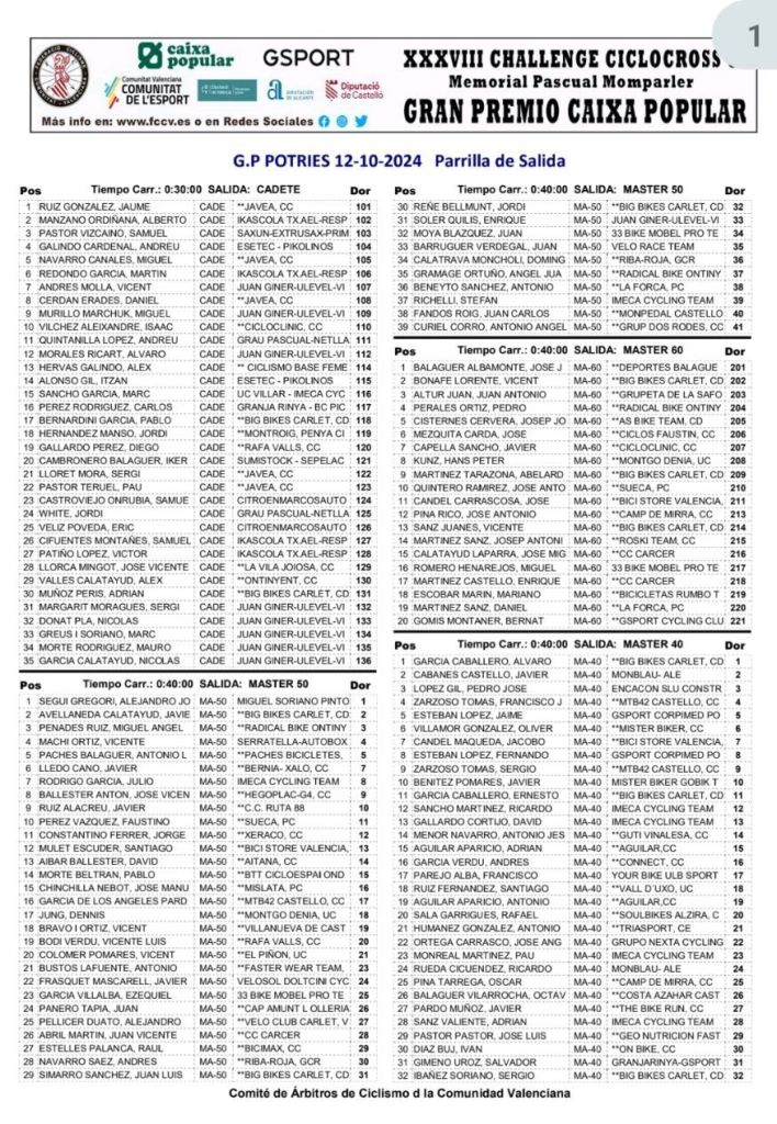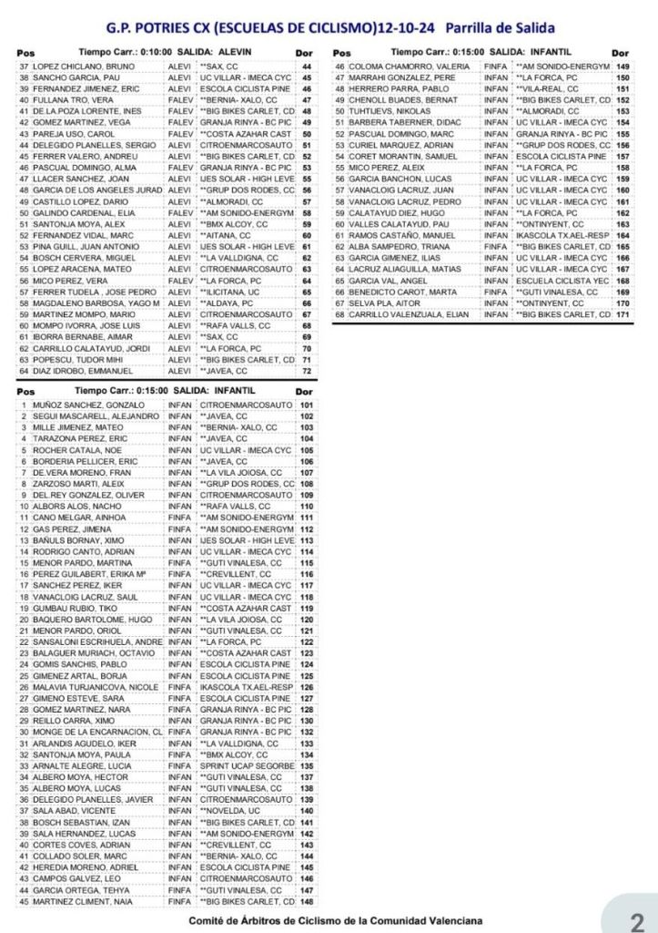 Las parrillas de salida, tanto de Escuelas de Ciclismo como adultos, son la siguientes: