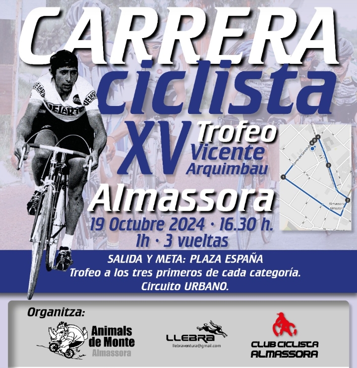 El sábado, día 19 de octubre, se disputa en Almassora el XV Trofeo Vicente Arquimbau organizado por Animals de Monte. La salida se dará a las 16.30 y la prueba discurrirá por un circuito urbano. La partida y meta estará situada en la Plaza de España y el pelotón estará pedaleando durante una hora y, posteriormente, se darán tres vueltas más al trazado hasta conocer el nombre del ganador.