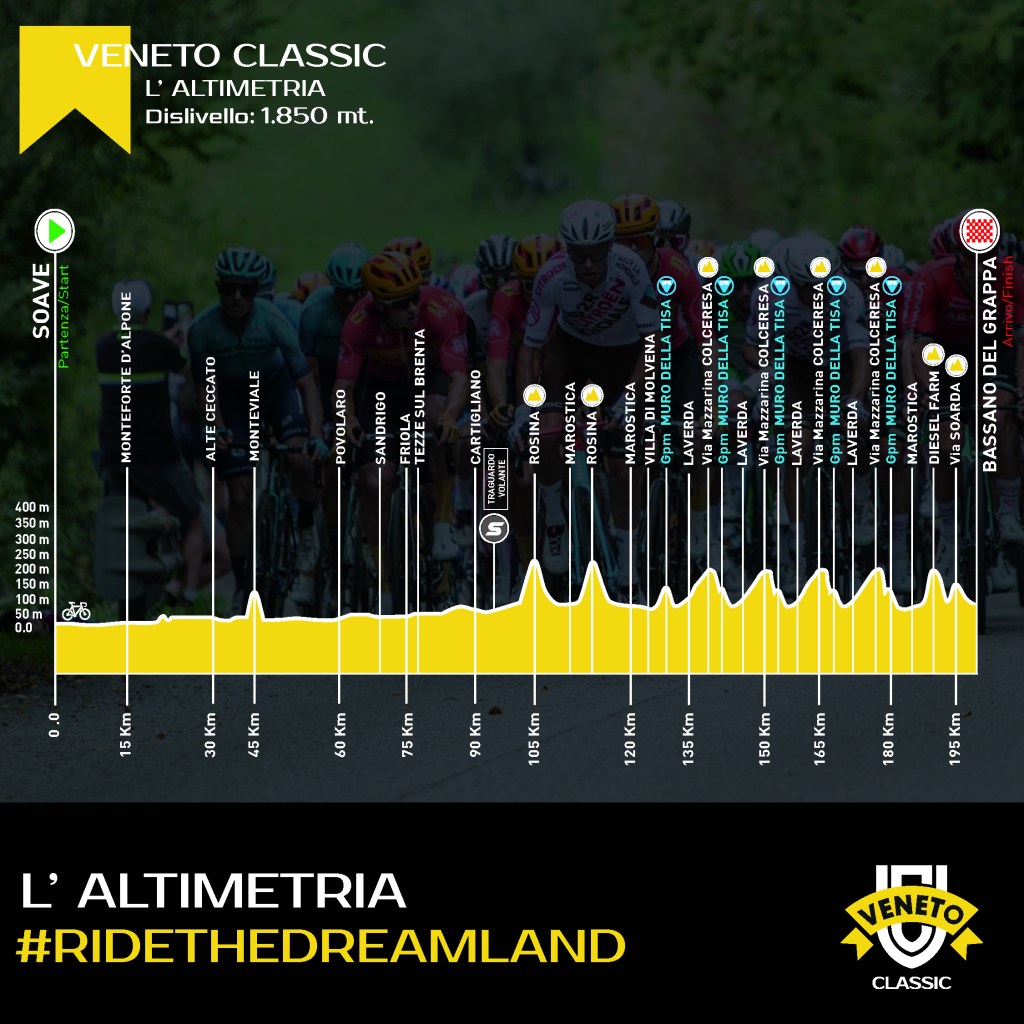 Pau Martí cierra la competición en carretera en la cuarta edición de la Véneto Classic que se disputa el domingo. Recorrido espectacular y distintivo el de esta carrera, con un arranque llano y una segunda mitad muy explosiva. Dos pasos por Rosina (2 km al 6%); un circuito principal con cuatro pasos por Via Mazzarina -6 km de ascensión- y el brutal Muro della Tisa, 200m sobre auténticos cascotes con rampas de hasta el 18%; y las cotas finales de Diesel Farm (1 km al 11%; tierra tanto en la subida como en la bajada) y Via Soarda -rampas del 13%-, a coronar a 4 del final.