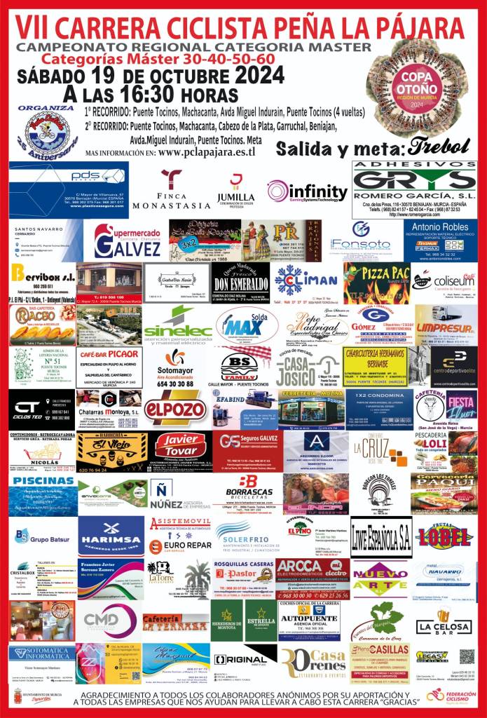 Este sábado, 19 de octubre, se disputa en Puente Tocinos, a partir de las 16.30 horas, la VII CARRERA CICLISTA PEÑA LA PÁJARA. La prueba coronará a los campeones autonómicos de la Región de Murcia de las categorías Máster 30, 40, 50 y 60. Presencia de ciclistas de la Comunidad Valenciana. Lista de inscritos.