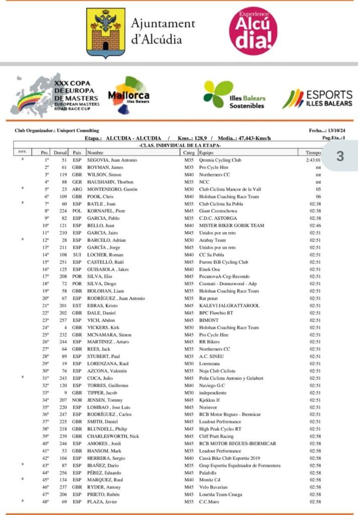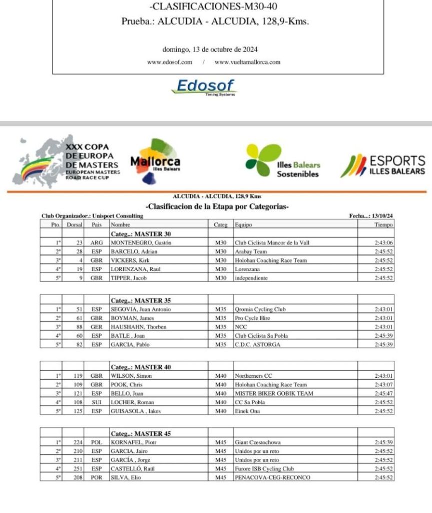 El alteano Juan Bello (Mister Biker Gobik Team) finalizó décimo en la XXX Copa de Europa de Másters que se disputó en Alcúdia, en las categorías Masters 30-35-40-45, en las que se impuso Juan Antonio Segovia (Qromia Cycling Club) por delante de James Boyman (Pro Cycle Hire) y Simon Wilson (Northerners). Llegó una escapada de seis ciclistas. En Máster 40, Bello subió al podio como tercero y fue primer español tras firmar una gran carrera.