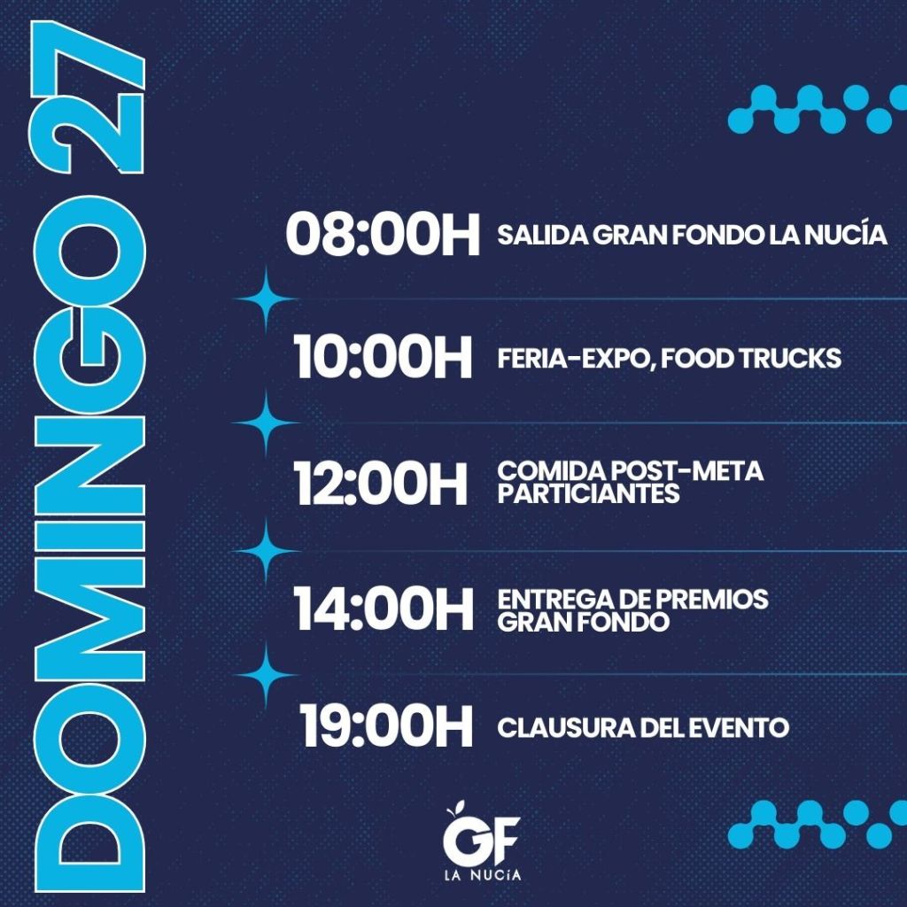 El domingo 27 de octubre, el ciclismo continúa con la disputa del Gran Fondo de La Nucía, que arrancará a las 8:00 horas. Esta prueba, orientada a todo tipo de ciclistas, incluido amateurs, ofrece a los participantes la posibilidad de recorrer las carreteras de la provincia de Alicante en un recorrido con dos distancias diferentes: 76 y 166 kilómetros respectivamente.