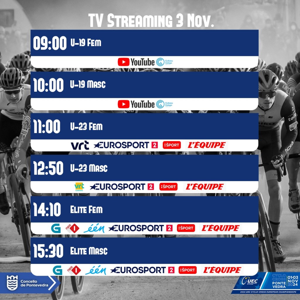 Pero el seguimiento está garantizado también para todas las pruebas máster del viernes y Team Relay del sábado, así como las pruebas junior del domingo. La Federación Ciclismo Galego emitirá a través de su canal de Youtube en directo el resto de competiciones, con señal abierta a nivel mundial. La mejor garantía de que no se pierde detalle del Campeonato de Europa de Ciclocrós en Pontevedra.