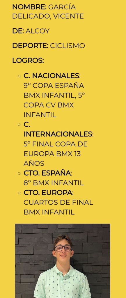 Hoy, lunes 28 de octubre, a las 20,30 horas en el auditorio ADDA de Alicante, tendrá lugar la XL Gala Provincial del Deporte Alicante, donde serán entregados los Premios Deportivos Provinciales 2024. Los galardones están divididos en cinco categorías: Mejor Deportista Masculino, Mejor Deportista Femenina, Mejor Deportista Promesa, Mejor Deportista Discapacitado y Mejor Técnico. En la lista de candidatos aparecen Alejandro Martínez Chorro (Pista), en el apartado de Mejor Deportista Masculino; además de Belén Calvo, Fran Calvo, Paula Santonja, Vicente García y Xavi Cherro, de BMX, David Ivars (Ciclocross), Leyre Toledo y Héctor Álvarez (Ciclismo y Pista), como aspirantes al de Mejor Deportista Promesa. En el apartado de mejores clubes figuran el CC La Marina y el BMX Campello.