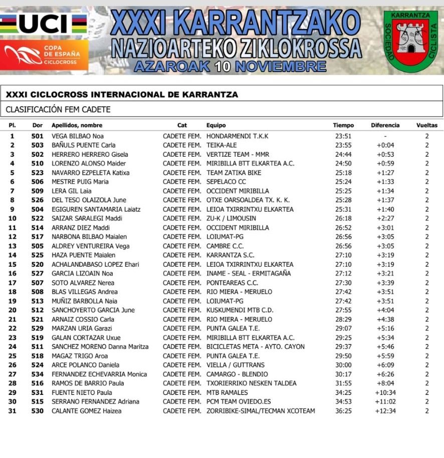 Entre las féminas, Maier Olano lograba su primera victoria en Copa de España en un circuito donde el año pasado fue segunda. La guipuzcoana dominó de principio a fin la prueba y entró en línea de meta con una renta de 29 segundos sobre Ana López, ganadora el año pasado en Karrantza, y 33 sobre Nahia García. La líder, Lidia Castro, ve recortada su diferencia en la general tras ocupar hoy la sexta plaza.