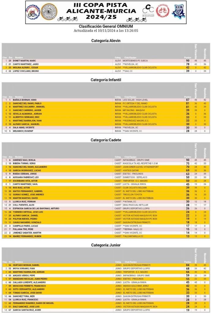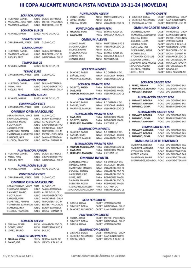 Tras la disputa de las dos primeras jornadas de la III Copa Pista Alicante-Murcia 2024-2025 lideran el Torneo Vicent Grauenkamp (Fundación Benicadell), en la categoría Élite; Mario Álvarez (Lucta Granja Rinya), en Sub 23; Borja Jiménez (Infinobras Grupo Sime) y María Manzano (Valverde Team), en Cadetes; Daniel Hurtado (Saxun Extrusax Primoti), en Júniors; Marc Donet (Sueca) y Vera Fullana (Bernia Xaló), en Alevines; y Ximo Bañuls (Ijes Solar) e Inéz Díaz (Rodríguez Magro), en Infantiles;