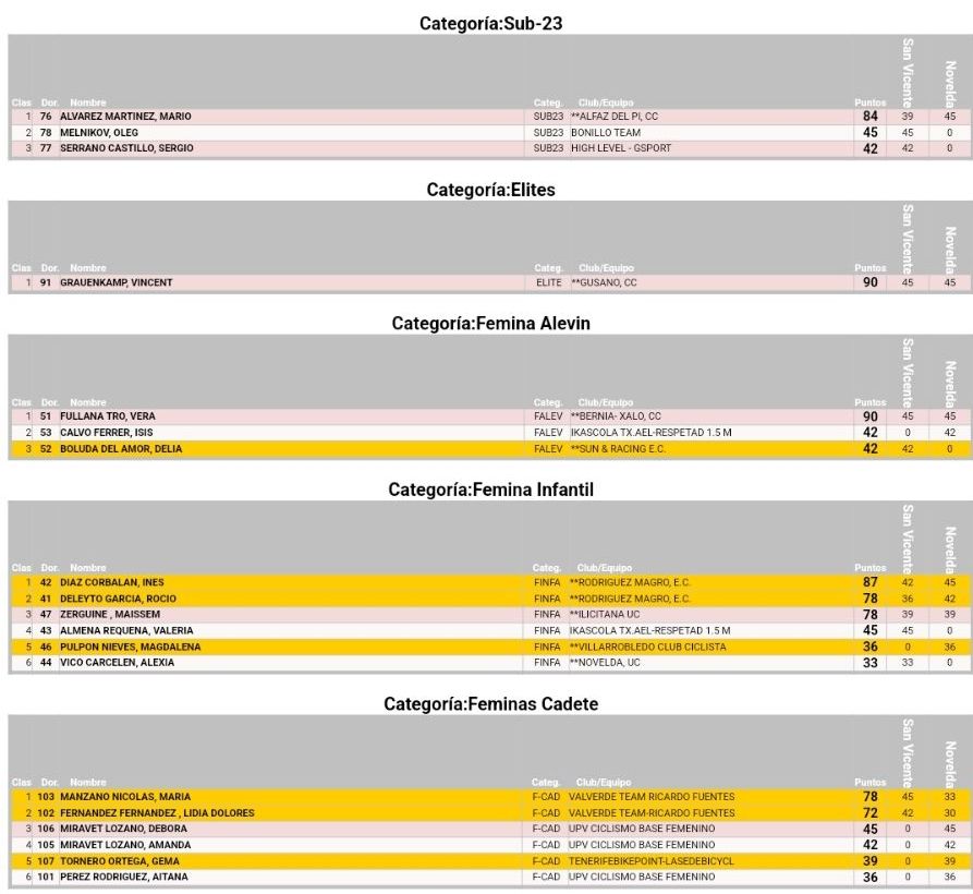 La prueba open la ha ganado Vicent Grauenkamp (Fundación Benicadell), con 187 puntos, por los 182 de Daniel Hurtado (Saxun Extrusax Primoti) y los 161 de Mario Álvarez (Lucta Granja Rinya). Borja Jiménez (Infinobras Grupo Sime) ha sido el mejor en cadetes, con 130 puntos. Nueve más que Alejandro Sánchez (Juan Giner-Ulevel-Vitadinsport) y 16 sobre Lucas García (+ Vatios Qatar). En féminas, Débora Miravet (UPV Ciclismo Base) ha sido la mejor cadete, por delante de su hermana Amanda, y de Gemma Tornero (Tenerife).