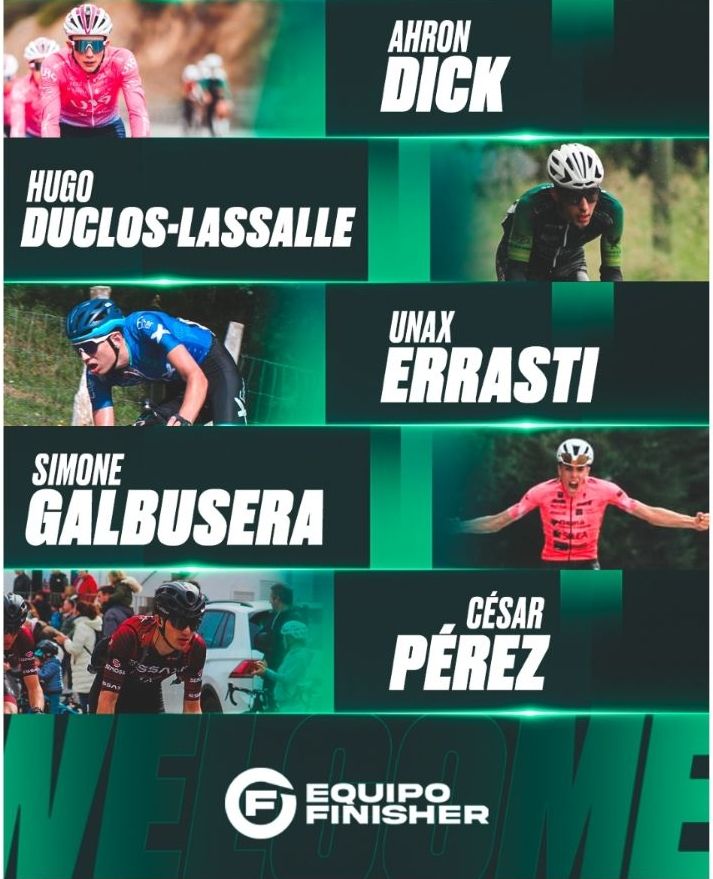 El Equipo Finisher completa su nómina de novedades para la temporada 2025 con la incorporación de cinco ciclistas más. César Pérez y Unax Errasti ya cuentan con experiencia en la categoría élite y sub23, mientras Ahron Dick, Hugo Duclos-Lasalle y Simone Galbusera aportarán valor internacional al conjunto navarro.