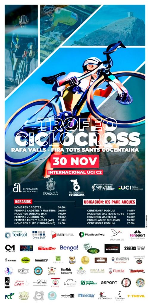 Siguen abiertas las inscripciones del II Trofeo Ciclocross Internacional Rafa Valls – Fira Tots Sants, prueba de carácter UCI C2 que se disputará el próximo 30 de noviembre en la localidad alicantina de Cocentaina. VER INSCRIPCIONES. La competición, que estará organizada por el CC Rafa Valls, será puntuable para la Challenge de Ciclocross de la CV en las categorías Máster, Cadetes y Escuelas. Es puntuable para el Raking Nacional. Es la primera C2 de la provincia de Alicante y reparte puntos UCI.