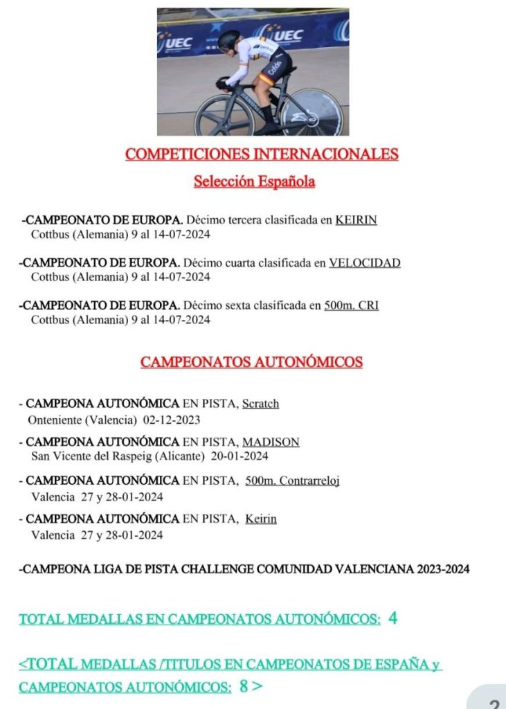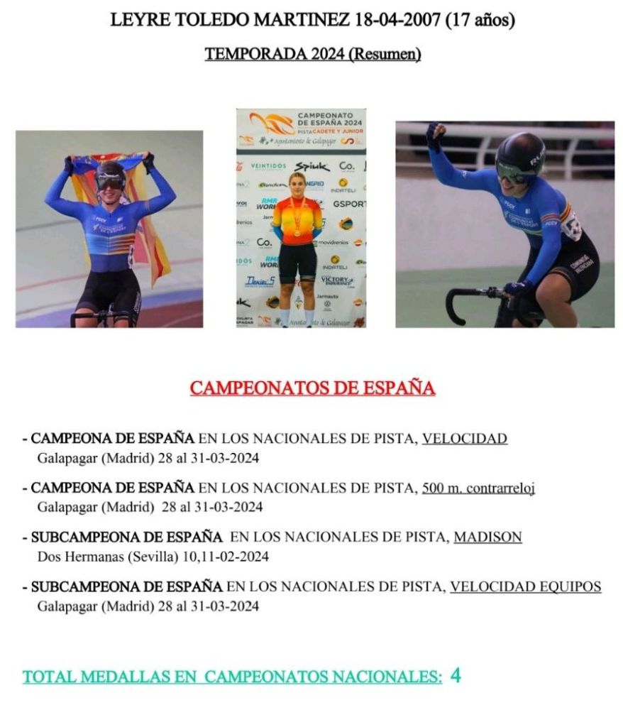 El auditorio del Centro Cívico acogió el sábado la Gala del Deporte 2024 de Novelda, el evento con el que se reconoce los logros, el esfuerzo y la dedicación de deportistas, clubes, entrenadores, patrocinadores y entidades deportivas de la localidad alicantina. Por tercer año consecutivo, Leyre Toledo Martínez fue nombrada mejor deportista de Novelda, premiando de esta manera su palmarés durante el último ejercicio tanto a nivel Nacional como Internacional. Toledo logró subir a lo más alto del podio como campeona de España Velocidad y 500 metros Km en Galapagar y consiguió el subcampeonato en Madison en Dos Hermanas y en Velocidad por Equipos, también en la pista madrileña. Consiguió también la victoria como júnior en la Liga de Pista de la CV y logró el título autonómico en Scratch, Madison, 500 m. Contrarreloj y en Keirin.