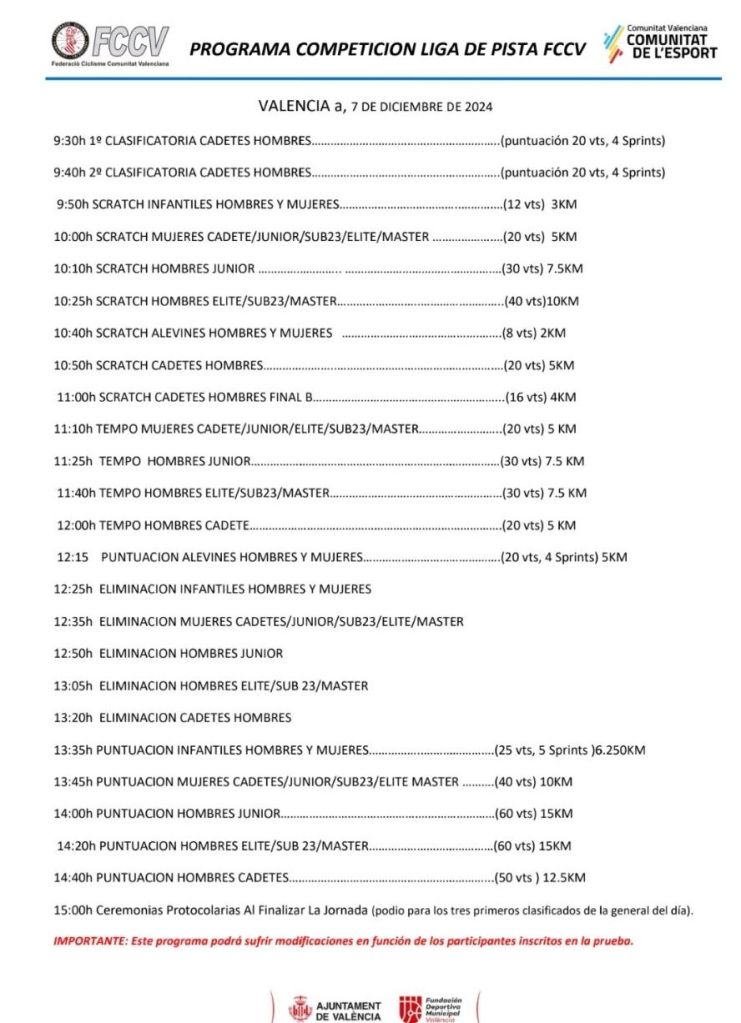 La FCCV informa que ya están abiertas las inscripciones de la primera prueba de La Liga de Pista de la Comunitat Valenciana que se celebrará el sábado 7 de diciembre en el Velódromo Luis Puig. En principio la competición estaba prevista iniciarse el 30 de noviembre pero fue aplazada con motivo de la reciente situación vivida en València y considerando que el Velódromo Lluis Puig se encontraba en una zona sensible de uso militar, debido a los trabajos de reconstrucción de los pueblos afectados. Se determino que dicha prueba se celebrará el próximo 14 de diciembre, con modificación de la sede, en la localidad de Novelda, en el velódromo Luis Navarro Amorós.