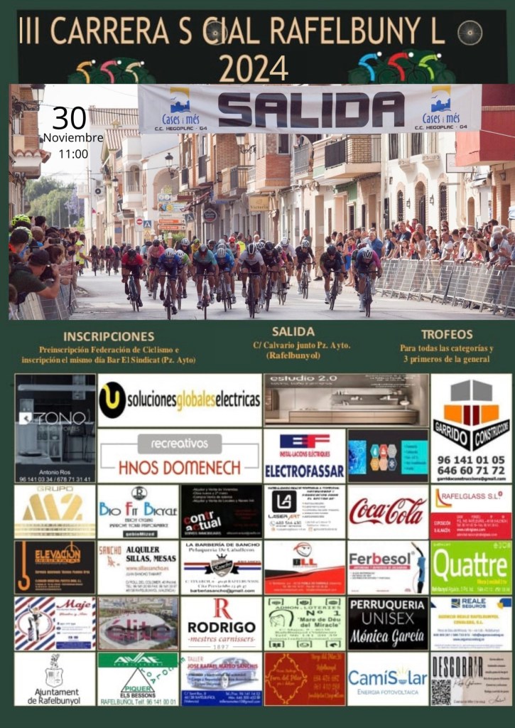 El próximo sábado, día 30 de noviembre, a partir de las 11 horas, se disputa el III Trofeu Social Rafelbunyol. Se darán 20 vueltas a un circuito de tres kilómetros hasta sumar los 60 previstos por la organización.