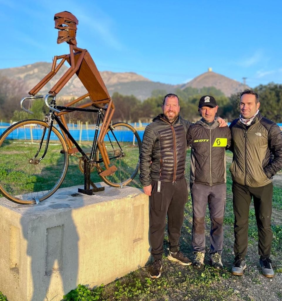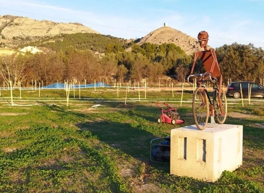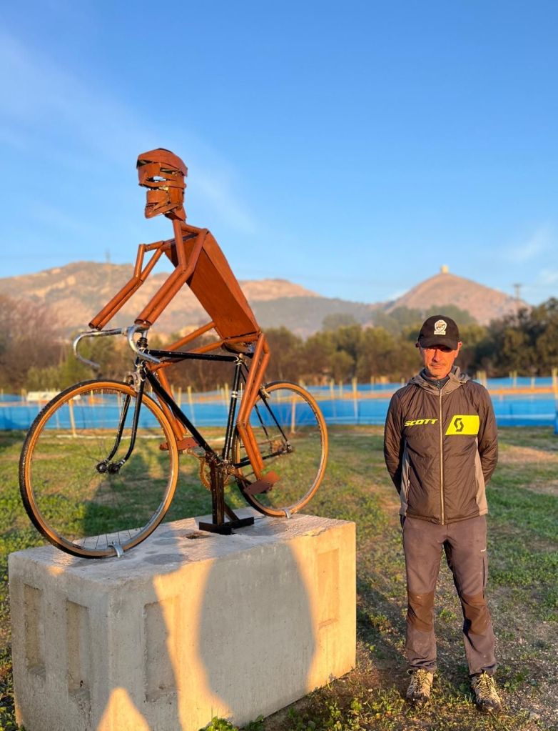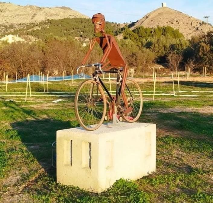 Los participantes y público en general del II CX Internacional Rafa Valls-Fira Tost Sants que se disputa en Cocentaina el sábado, 30 de noviembre, podrán hacerse un selfie o simplemente apreciar la escultura de un ciclista que ha sido realizada por Vicente Bodí, padre del ciclista alcoyano Jon Bodí que compite en el CC Jávea, en su totalidad de material reciclado. Es un homenaje al esfuerzo realizado por el CC Rafa Valls para que la carrera salga adelante. «La foto permitirá tener un bonito recuerdo del acontecimiento deportivo, con el castillo al fondo en lo alto de la montaña», explica su creador antes de mostrar su deseo: «Espero que sea un icono de nuestro deporte con esfuerzo y un canto al hecho de que con dedicación todo es posible. Hemos trabajado duro para hacer el circuito y la escultura refleja el esfuerzo y lo que se puede conseguir con voluntad, demostrando una vez más que hace más el que quiere, que el que puede».