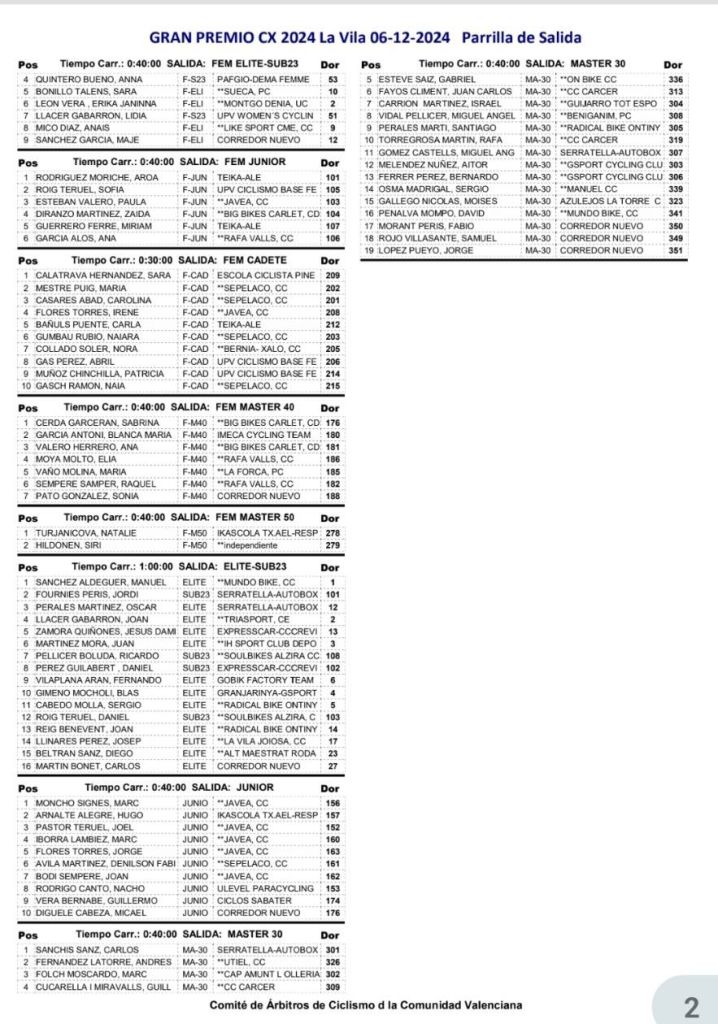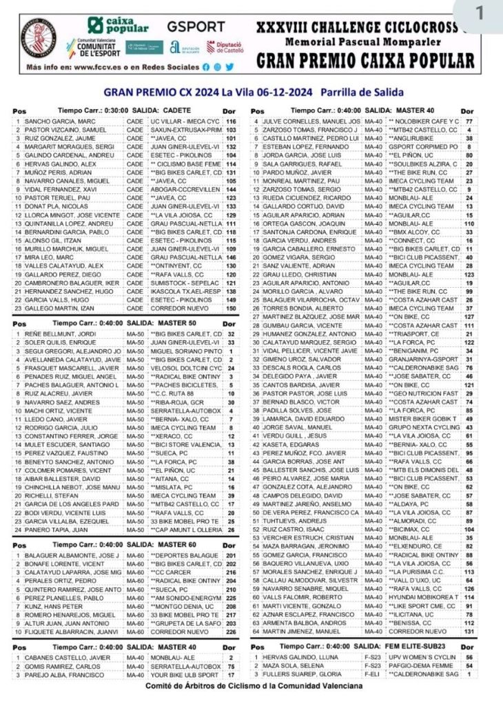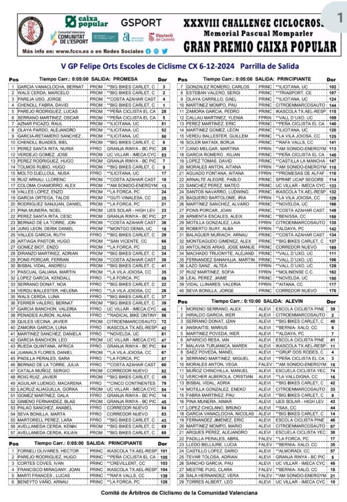 Calendario de la Challenge de Ciclocross CV – Memorial Pascual Momparler – Gran Premi Caixa Popular. General . Escuelas: General