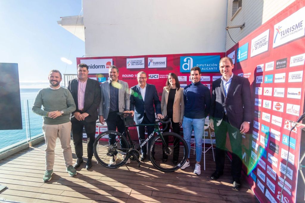 La impresionante terraza del Edificio Torrejó frente a la bahía mediterránea formada por la Playa de Levante de Benidorm fue el escenario escogido para la presentación de la Copa del Mundo de Ciclocross UCI – Benidorm Costa Blanca 2025. Casi medio centenar de personas entre autoridades, invitados y medios de comunicación asistieron al acto que, a 40 días de su celebración, lanza oficialmente la cuenta atrás de la gran fiesta del ciclocross en España.
