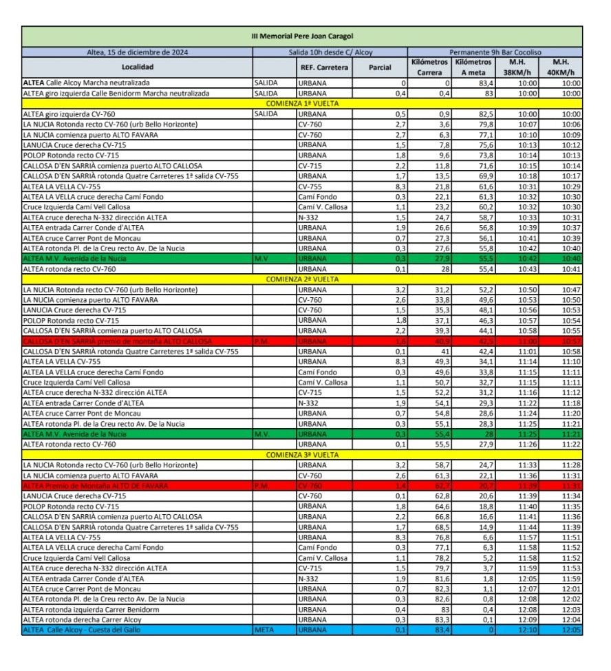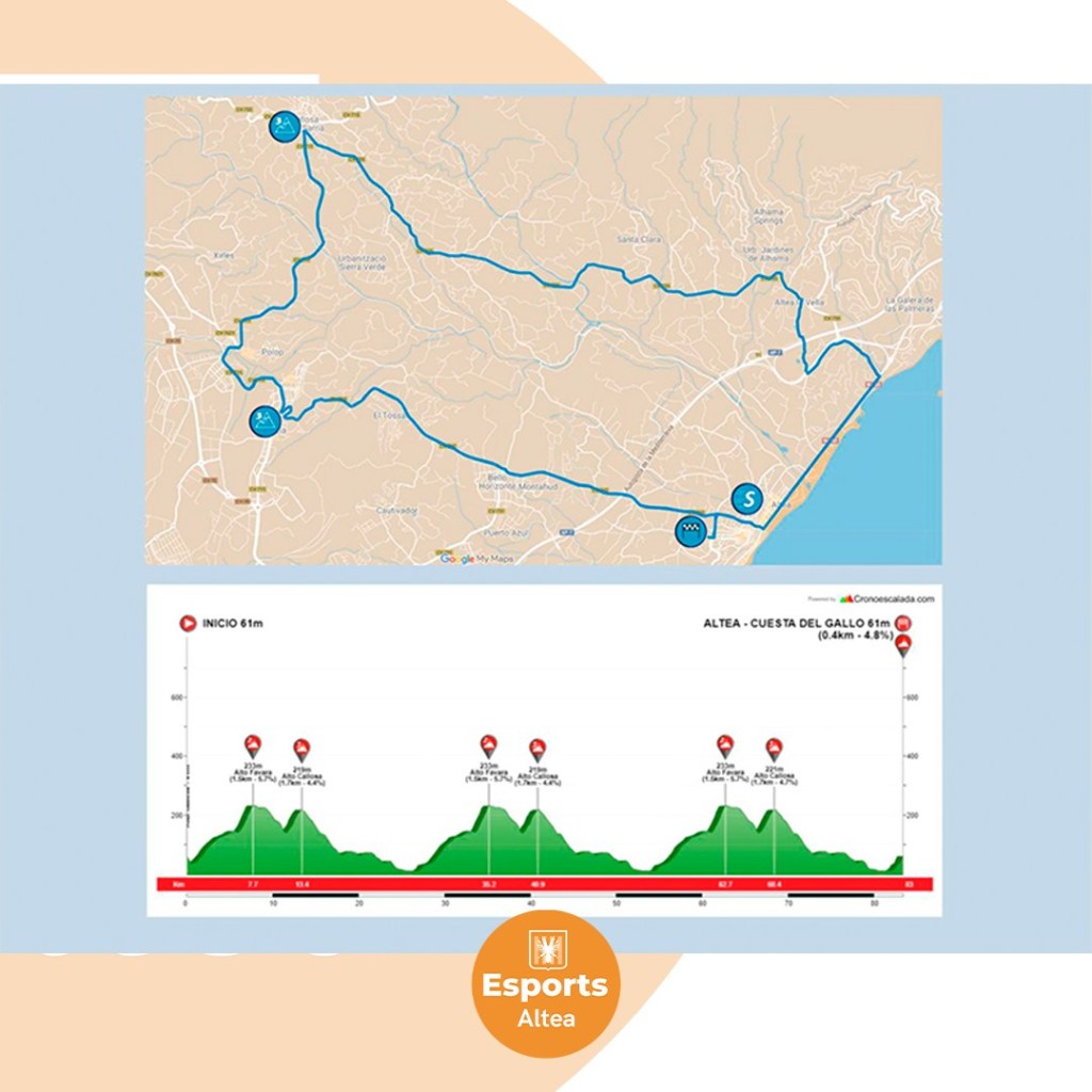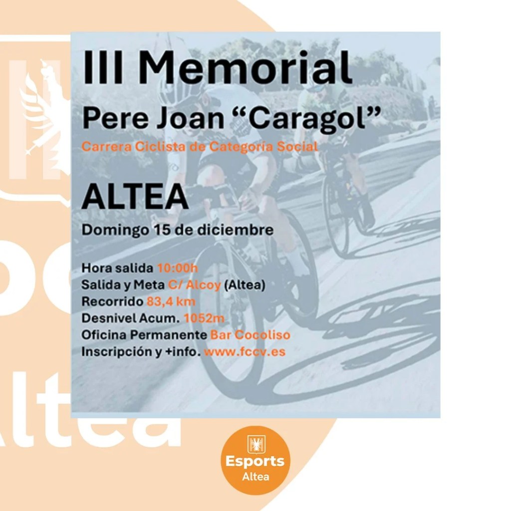 El domingo 15 de diciembre se disputa, a partir de las 10 horas, el III Memorial Pere Joan «Caragol«. La prueba, de Categoría Social, tendrá salida y meta en Altea en la calle Alcoy, frente al Palau. Cuenta con un circuito que va a de Altea a La Nucía, pasando por Polop, Altea la Vella y regresa al punto de partida. El pelotón realizará tres veces este trazado, hasta completar los 83,4 kilómetros previstos por la organización. Un magnífico recorrido en carretera, poco común en los últimos tiempos en los que predominan los circuitos urbanos, con las 3 subidas hacia La Nucía y Callosa d’Ensarria y más de mil euros en premios. La participación es de 97 corredores (Faltan cinco por pagar la inscripción).