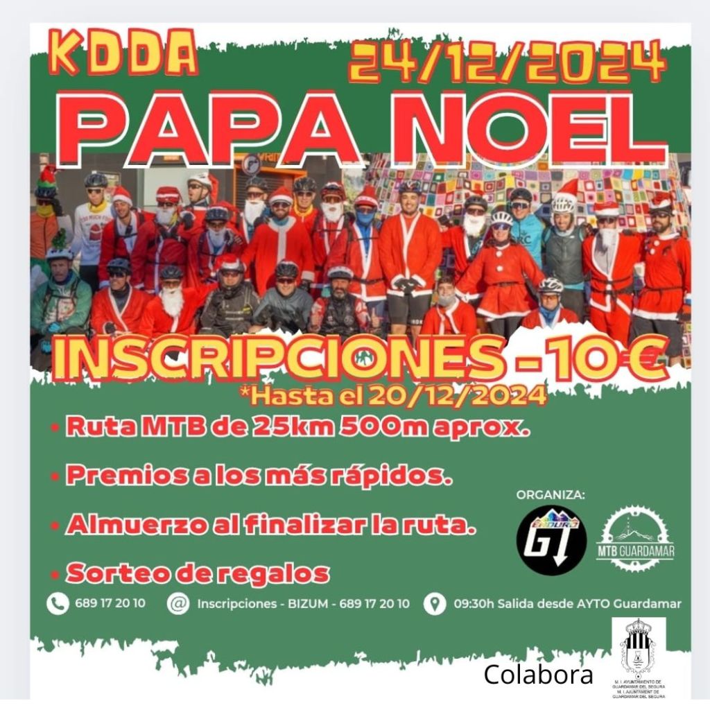 Este viernes, día 20, se cierran las incripciones de la la tradicional KDDA de Papa Noel que estará organizada por Enduro Guardamar Team y MTB Guardamar en la localidad costera alicantina. La ruta, prevista para el 24, partir de las 9.30 horas, es asequible para todos los públicos. Parte del Ayuntamiento y se dará una vuelta por el pueblo animando las celebraciones navideñas, acabando en la Casita de Papa Noel en la Plaza Porticada, en la que se realizará un concurso de equilibrio y carrera a una rueda. Los interesados solo tienen que inscribirse enviando un whatsapp al 689 17 20 10 e ingresando un bizum de 10 euros a ese mismo número.