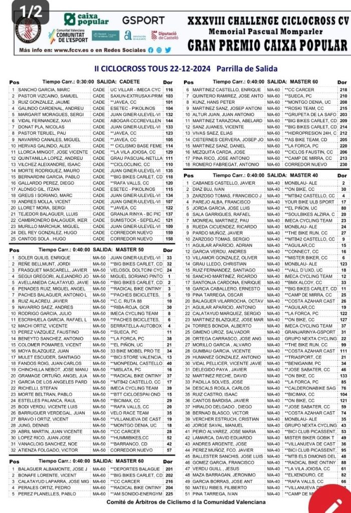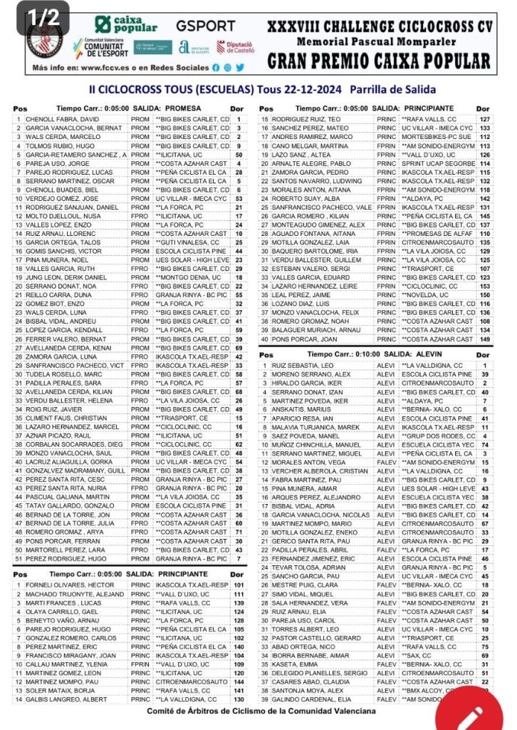 Calendario de la Challenge de Ciclocross CV – Memorial Pascual Momparler – Gran Premi Caixa Popular. General . Escuelas: General
